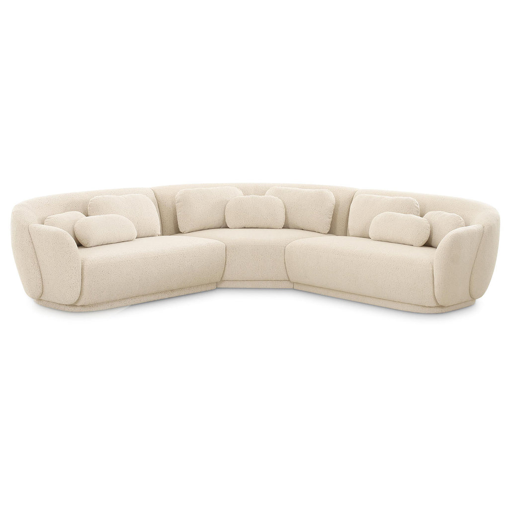 Introducing Misty: This textured sectional is a welcome addition to any home. It doesn't get cozier than this mid-century inspired design, topped with coordinating pill-shaped pillows and upholstered in a delicious cream boucle! Pair with the Misty sofa or chair to complete the look.