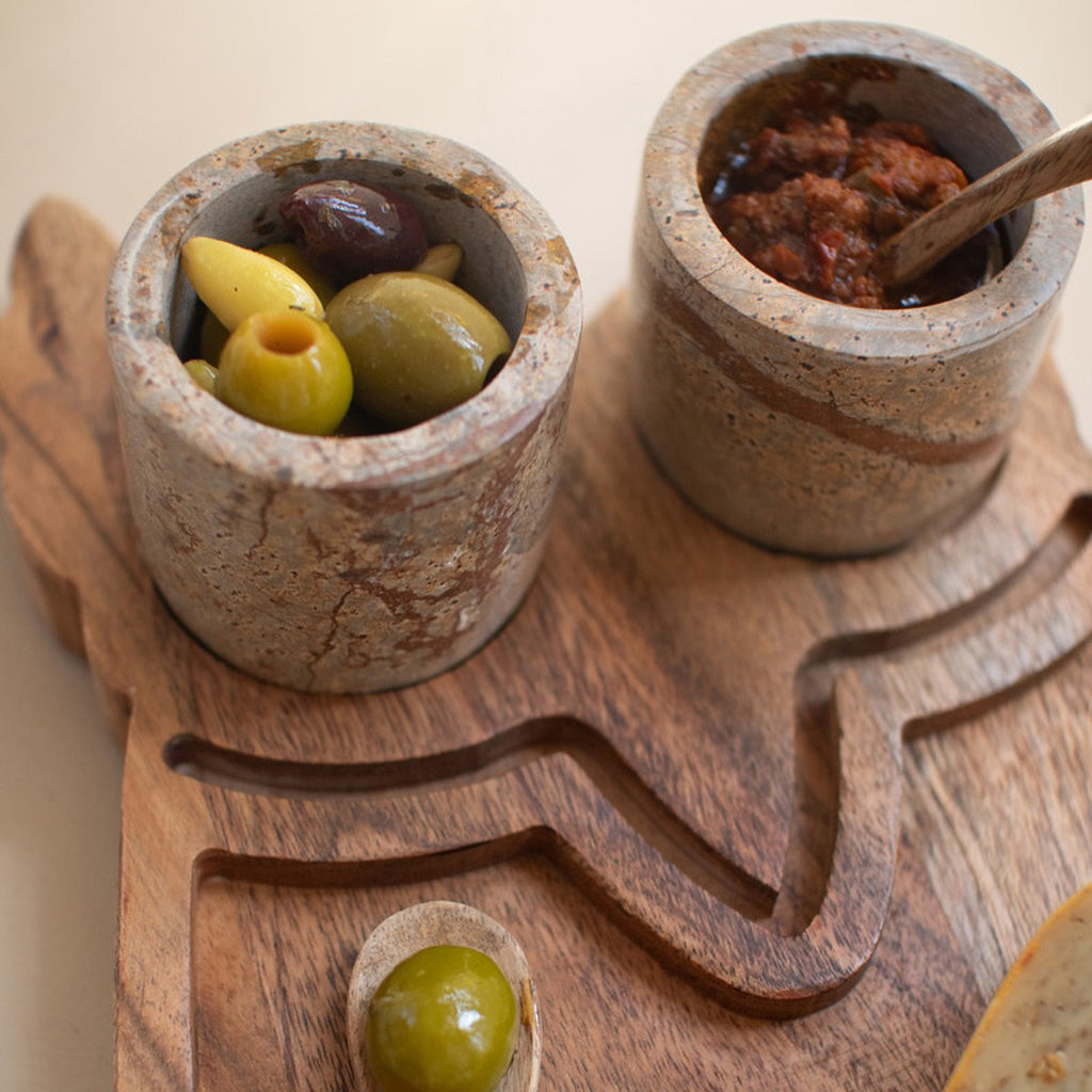 • Set includes 1 board, 2 marble bowls and 2 wooden spoons.