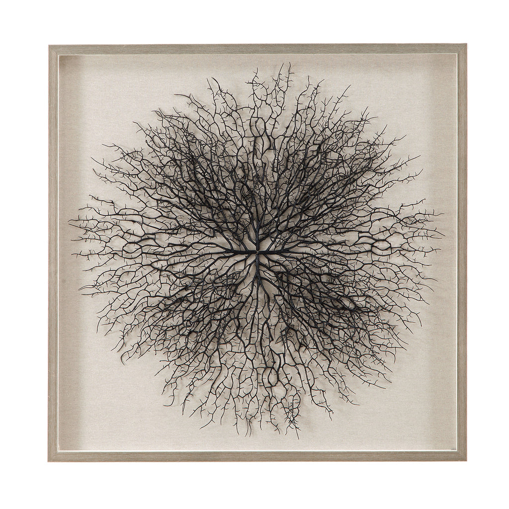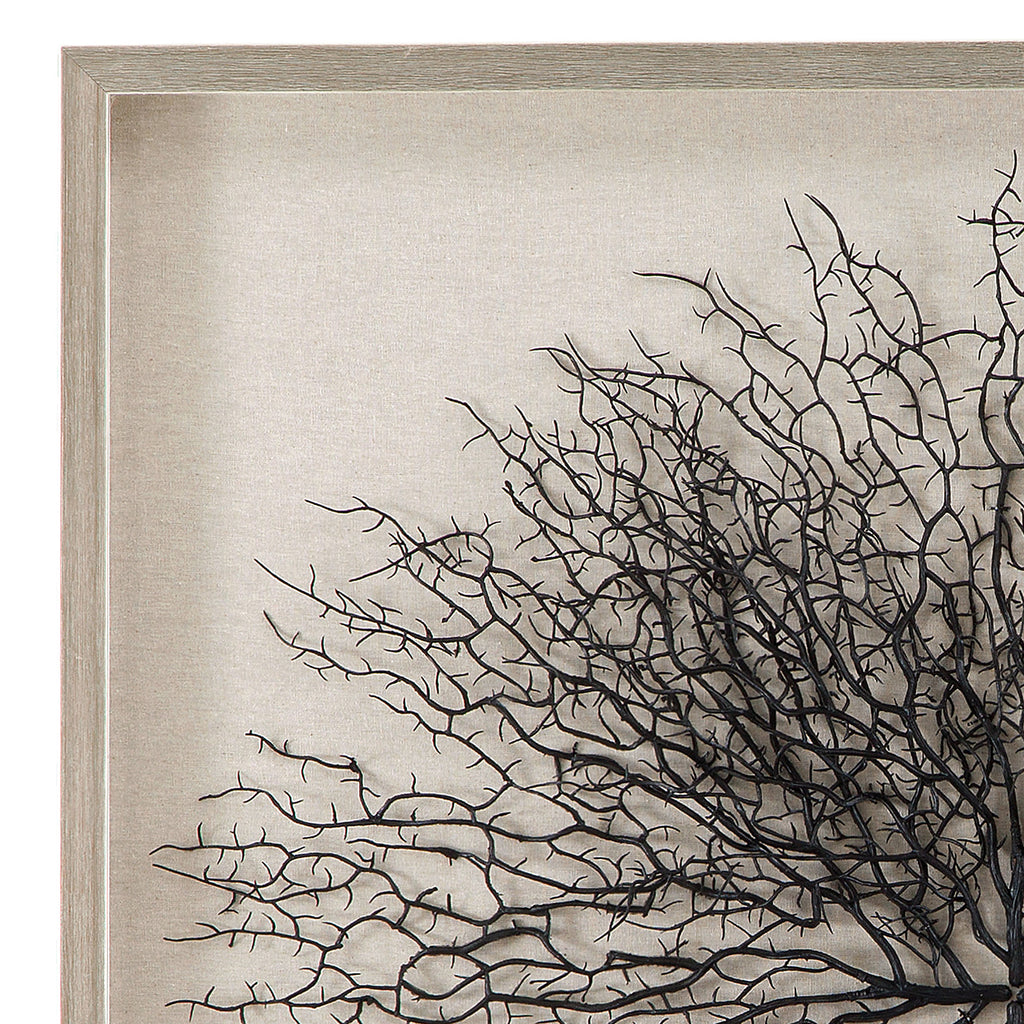 Gracee Wall Art is a shadow box accentuated with a neutral matboard and a sea fan with an accenting silver molding.