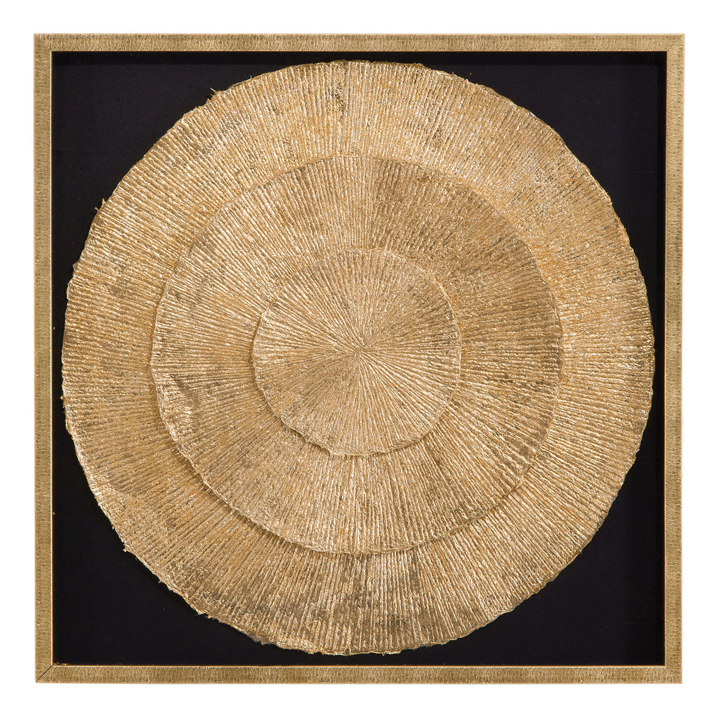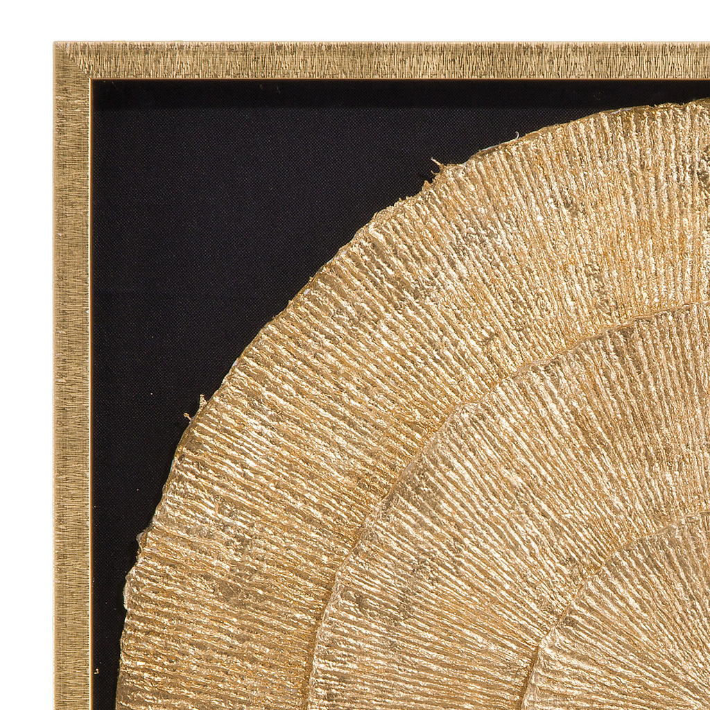 Ophelia Wall Art is a shadow box accentuated with a black mat and a gold fan with an accenting gold molding.