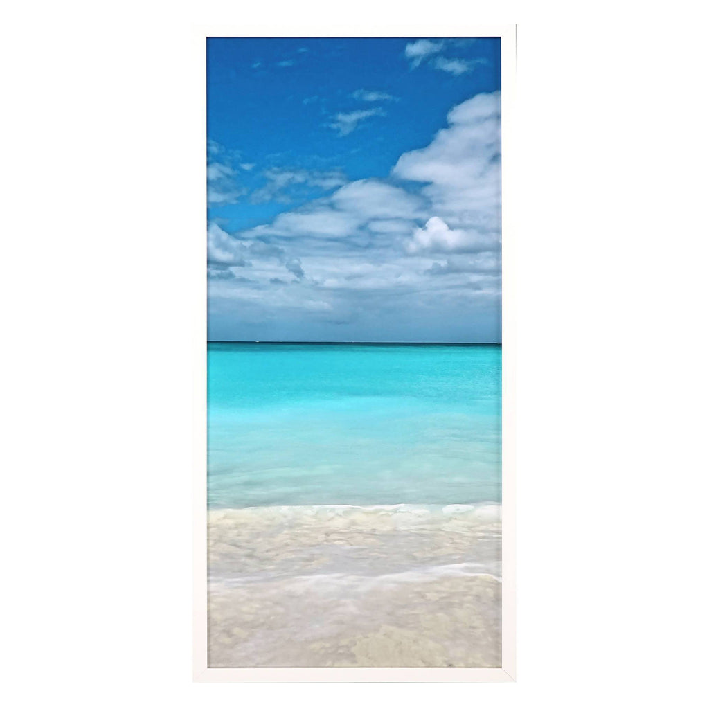 Beautiful day at the beach! A sandy beach contrasts against a luminous ocean of blue. Framed in a lacquered white wood shadow box style moulding.