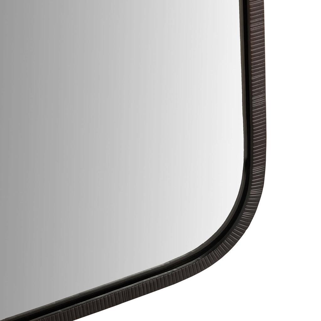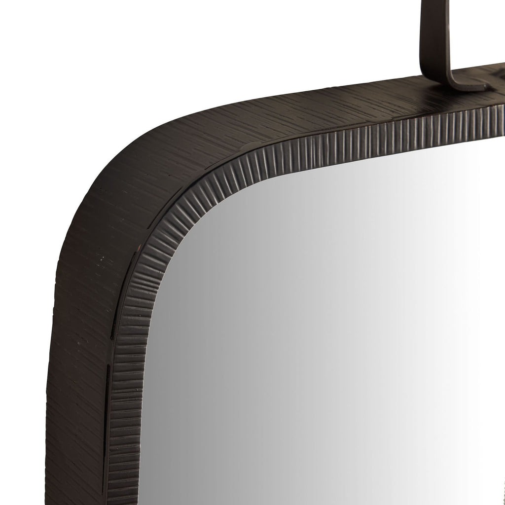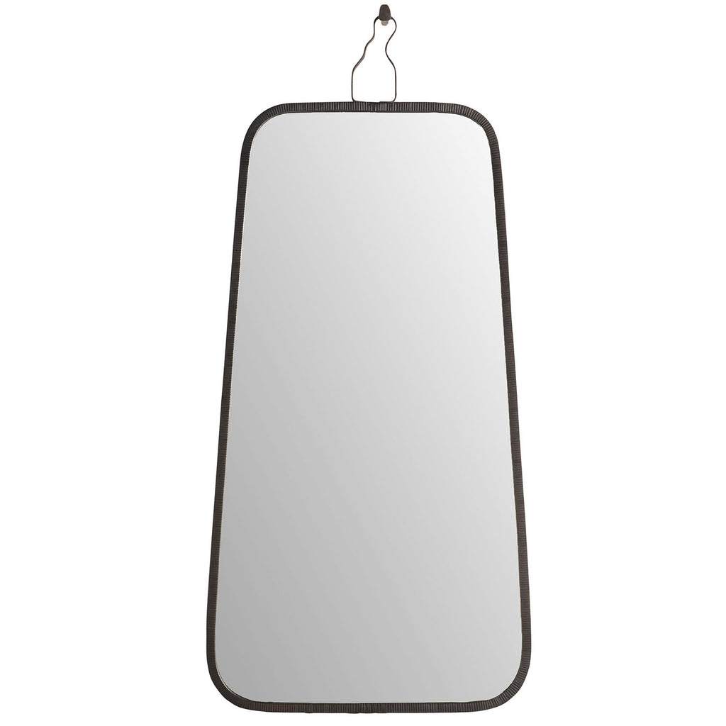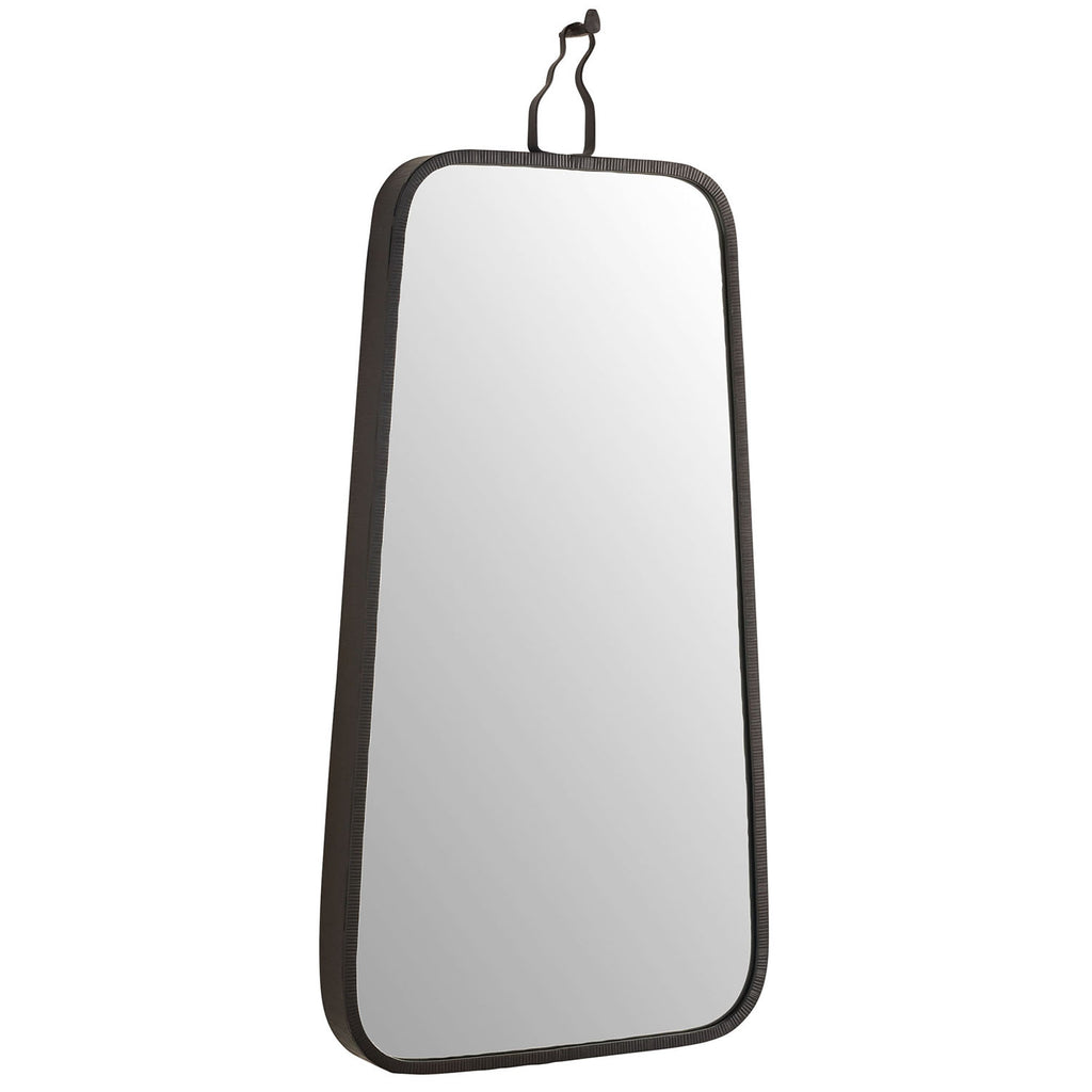 A unique design that fools the eye. The spike holding the mirror appears to have been hammered into the wall, when in fact the piece is actually suspended from a cleat on the mirror’s back. The spike is purely decorative. The iron frame is finished in burnt wax and the plain mirror makes this functional; finish will vary.