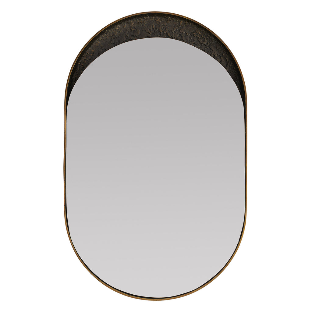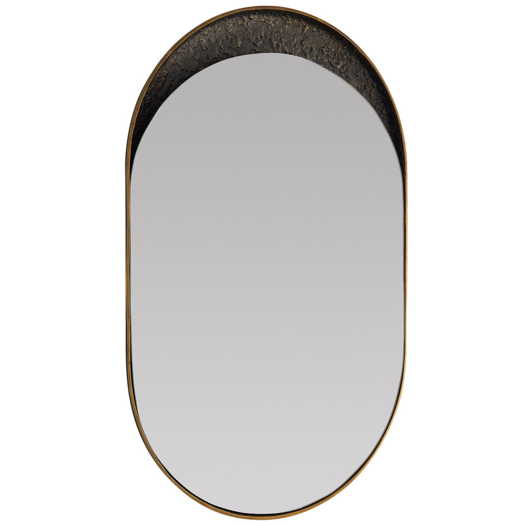 Playing with the concept of filled and unfilled forms, the Inset wall mirror's smooth glossy surface is set within a deeply textured, bronze-plated aluminum form as if it were being poured into a void. The offset, antique brass plated aluminum pill shaped elements create a sense of sliding motion, making the mirror a uniquely modern, dynamic choice for interiors of all kinds. The Inset mirror can be hung vertically or horizontally to create unique compositions. Finished with a cleat at the back for security. Finish will vary.