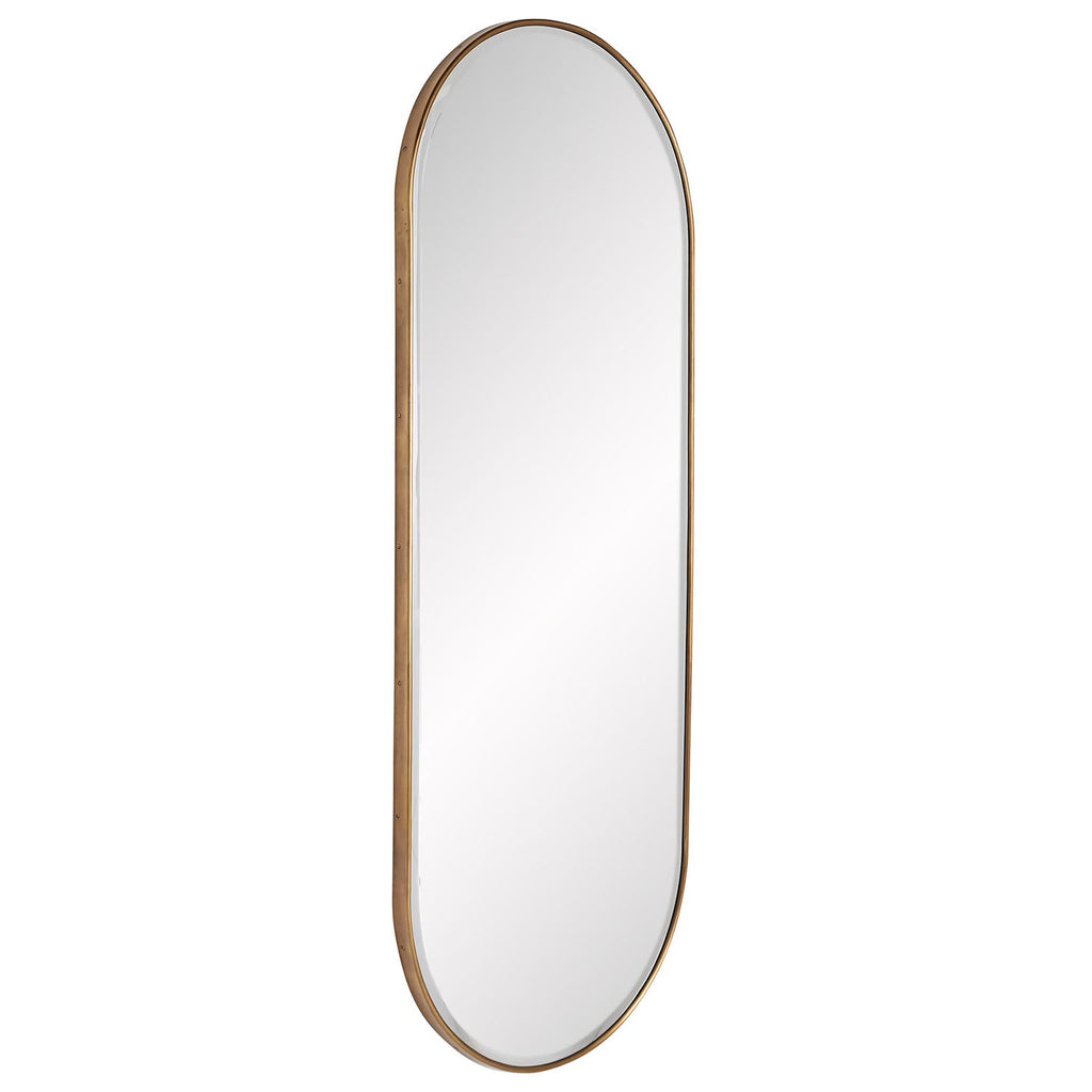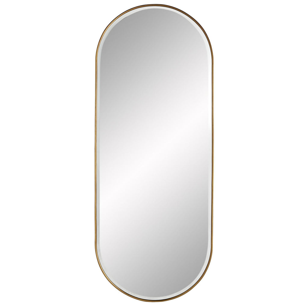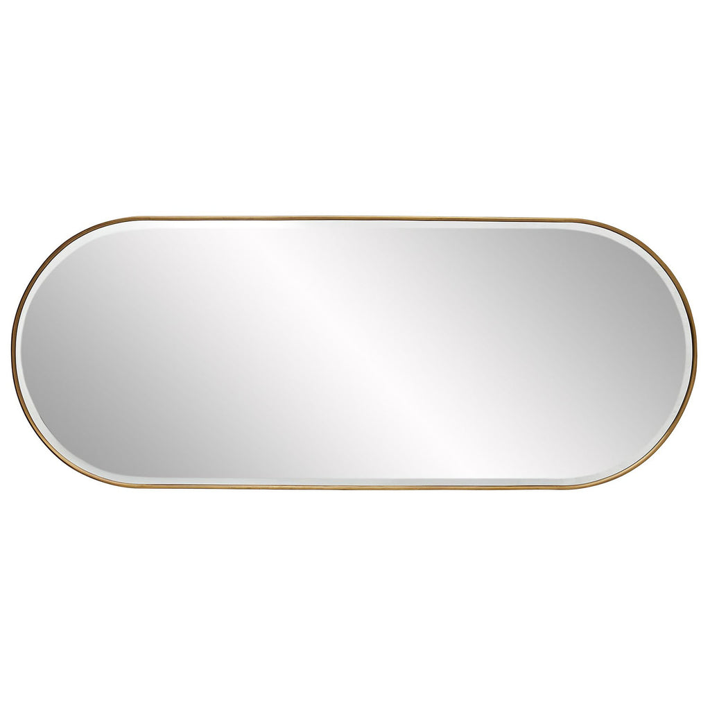 Classic and chic, this full-length mirror lets you reflect on it all. The oblong shape lends a contemporary touch to its traditional style. The unobtrusive frame is crafted from iron with a vintage brass finish and the plain mirror makes this piece functional. Features multiple security cleats to hang vertically or horizontally.