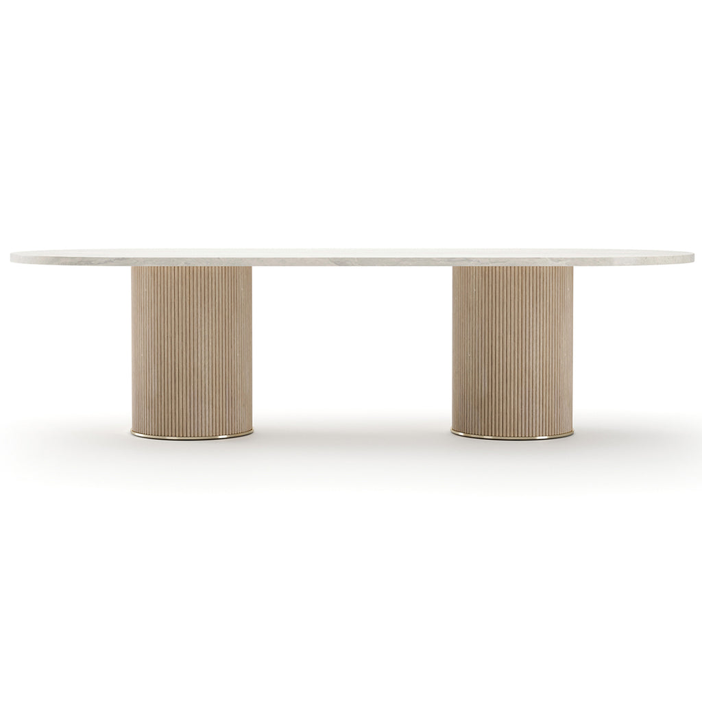 This dining table features a Creme Travertine oval stone top with Sun Drenched Oak trim and dual reeded wood pedestal bases accented by Lucent Bronze Metallic finish, emphasizing luxurious design and materials.