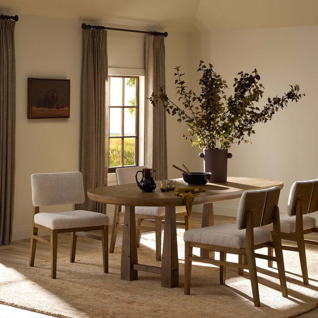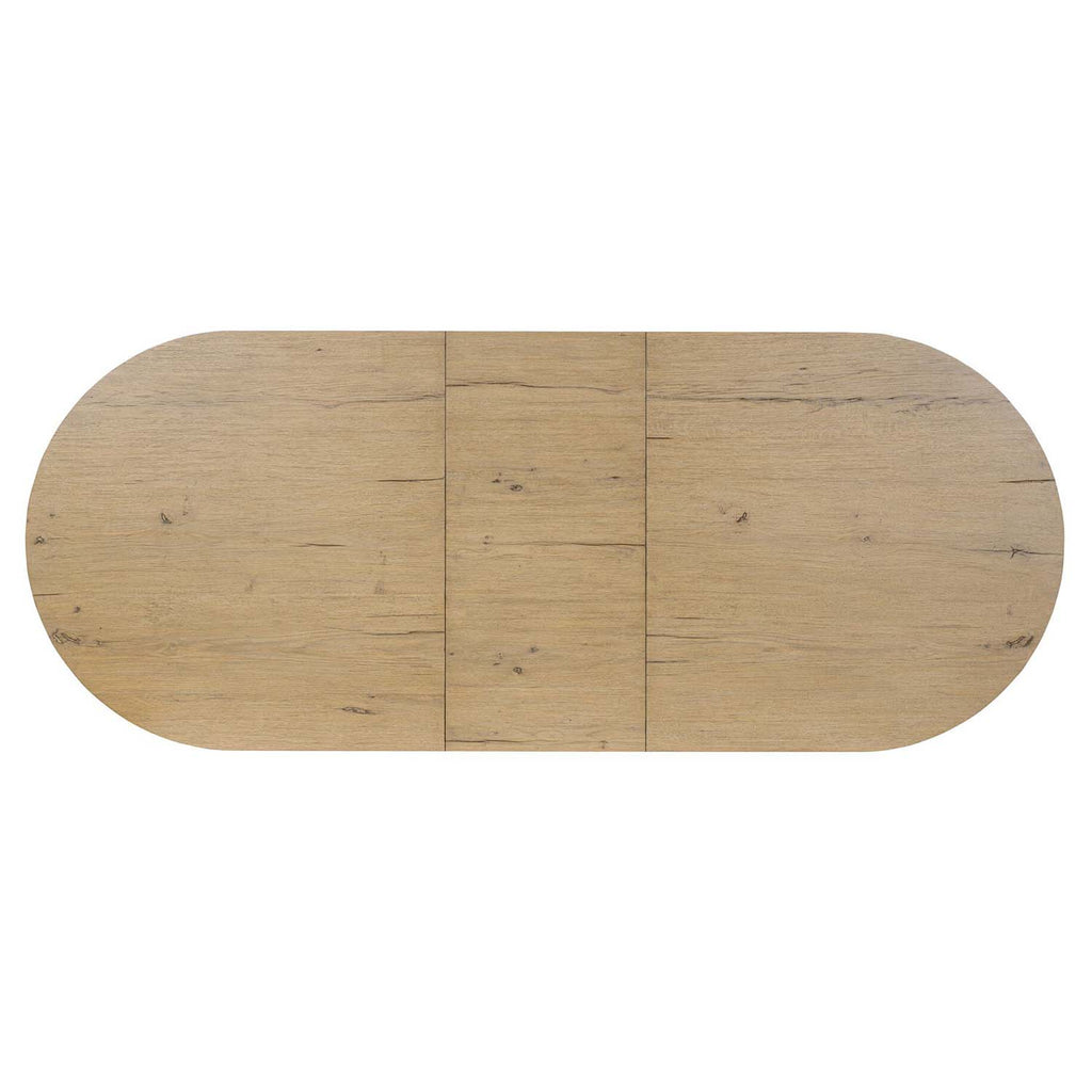 Make space to gather around. This extendable dining table is crafted from drifted oak veneer with a semi-trestle base, thick legs and an oval-shaped surface. The extension expands the table from 84" to a roomier 104".