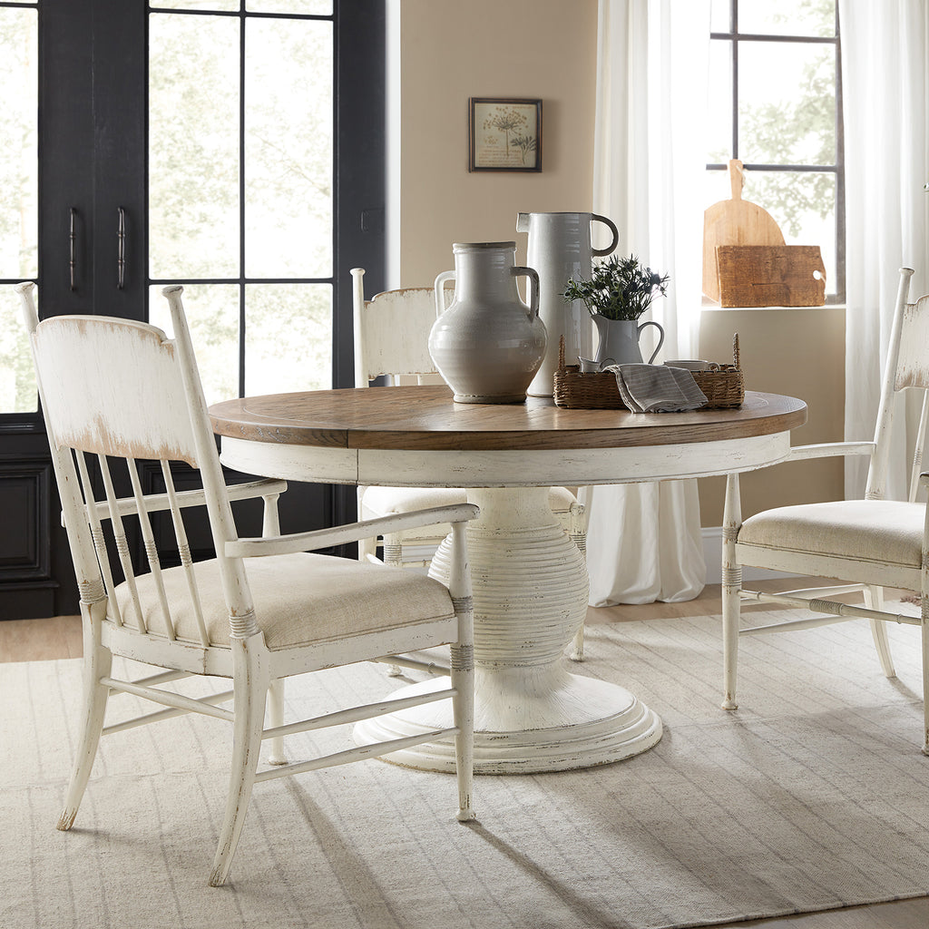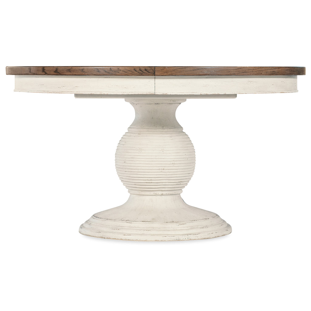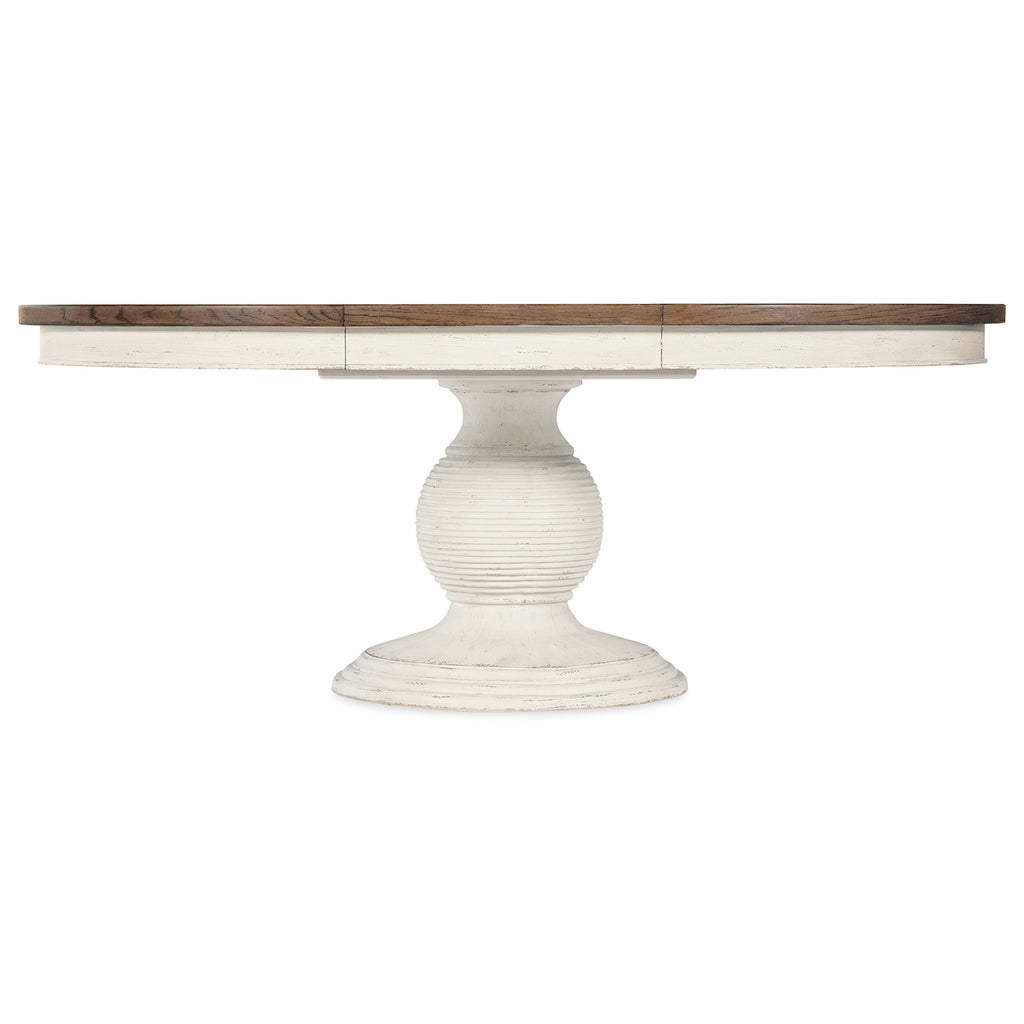 The Americana Round Pedestal Dining Table harkens back to a simpler, more genteel time. Crafted of Oak Veneers with a Solid-Wood Edge Top, it has a carved pedestal base. With the 22-inch leaf in place, the table extends to 76 inches round and accommodates up to two coordinating benches and two armchairs and up to 8 coordinating armchairs or side chairs. Without the leaf, it accommodates up to 6 coordinating arm or side chairs.