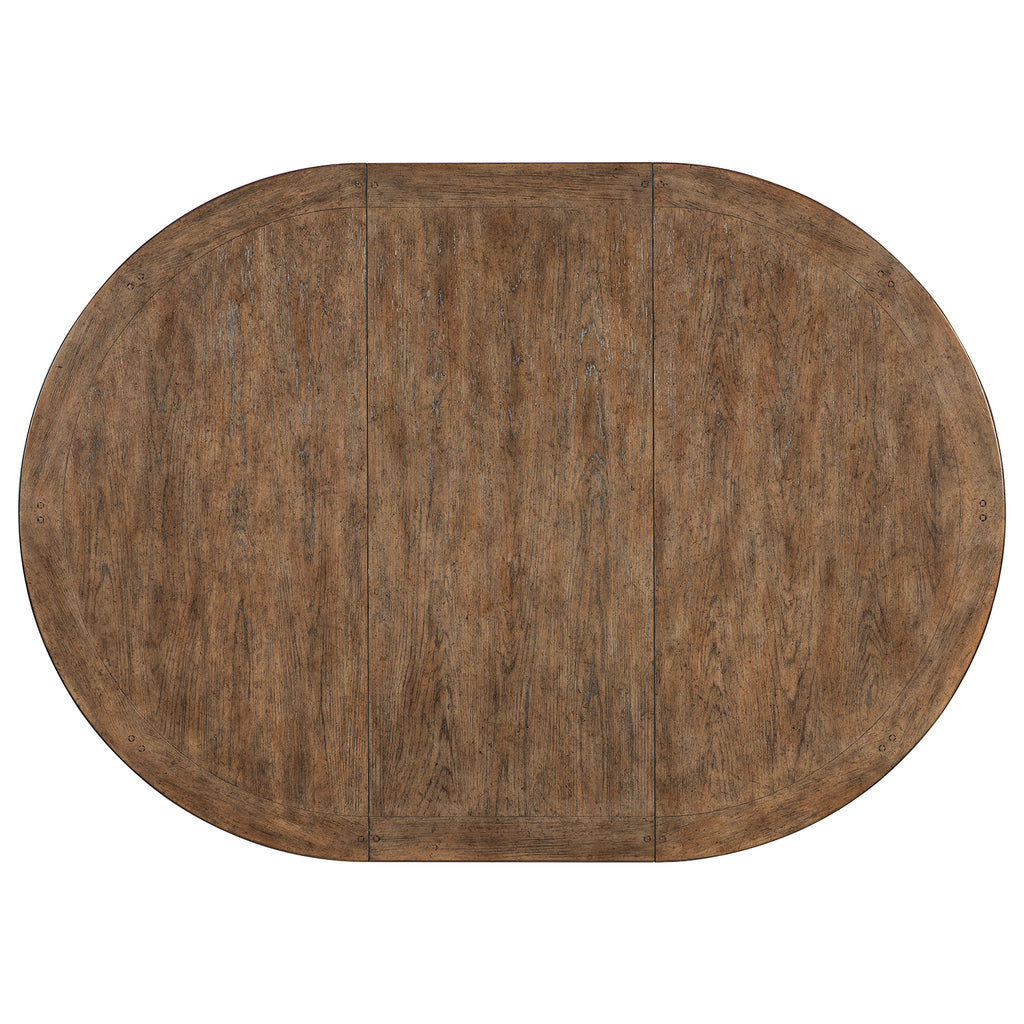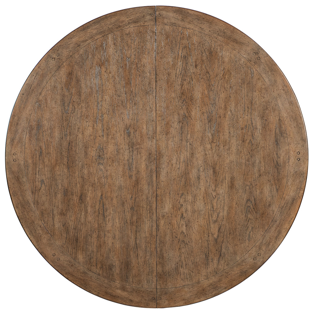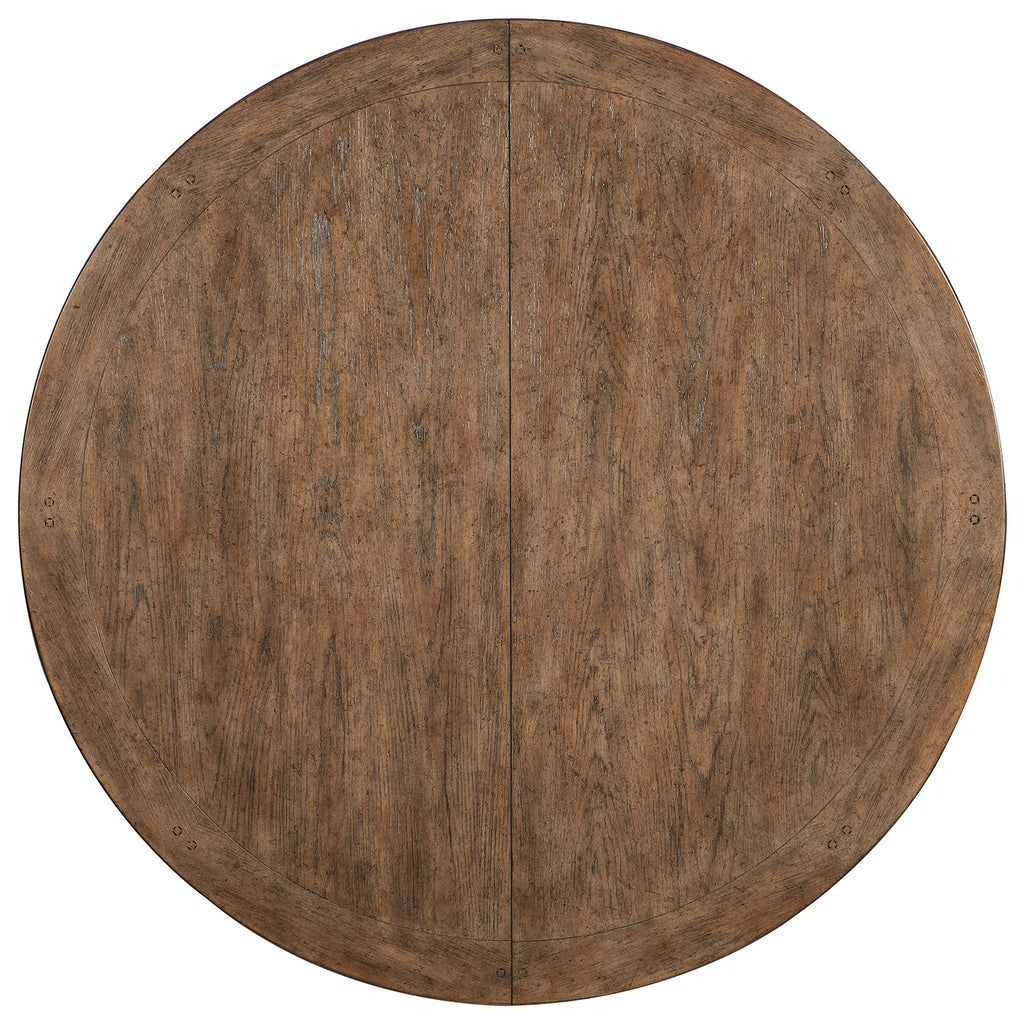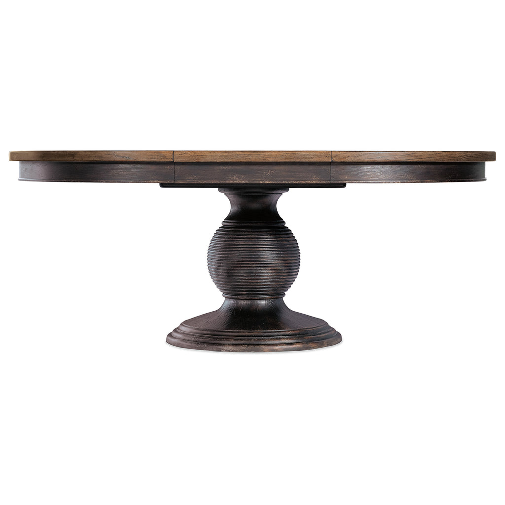 The Americana Round Pedestal Dining Table harkens back to a simpler, more genteel time. Crafted of Oak Veneers with a Solid-Wood Edge Top, it has a carved pedestal base. With the 22-inch leaf in place, the table extends to 76 inches round and accommodates up to two coordinating benches and two armchairs and up to 8 coordinating armchairs or side chairs. Without the leaf, it accommodates up to 6 coordinating arm or side chairs.