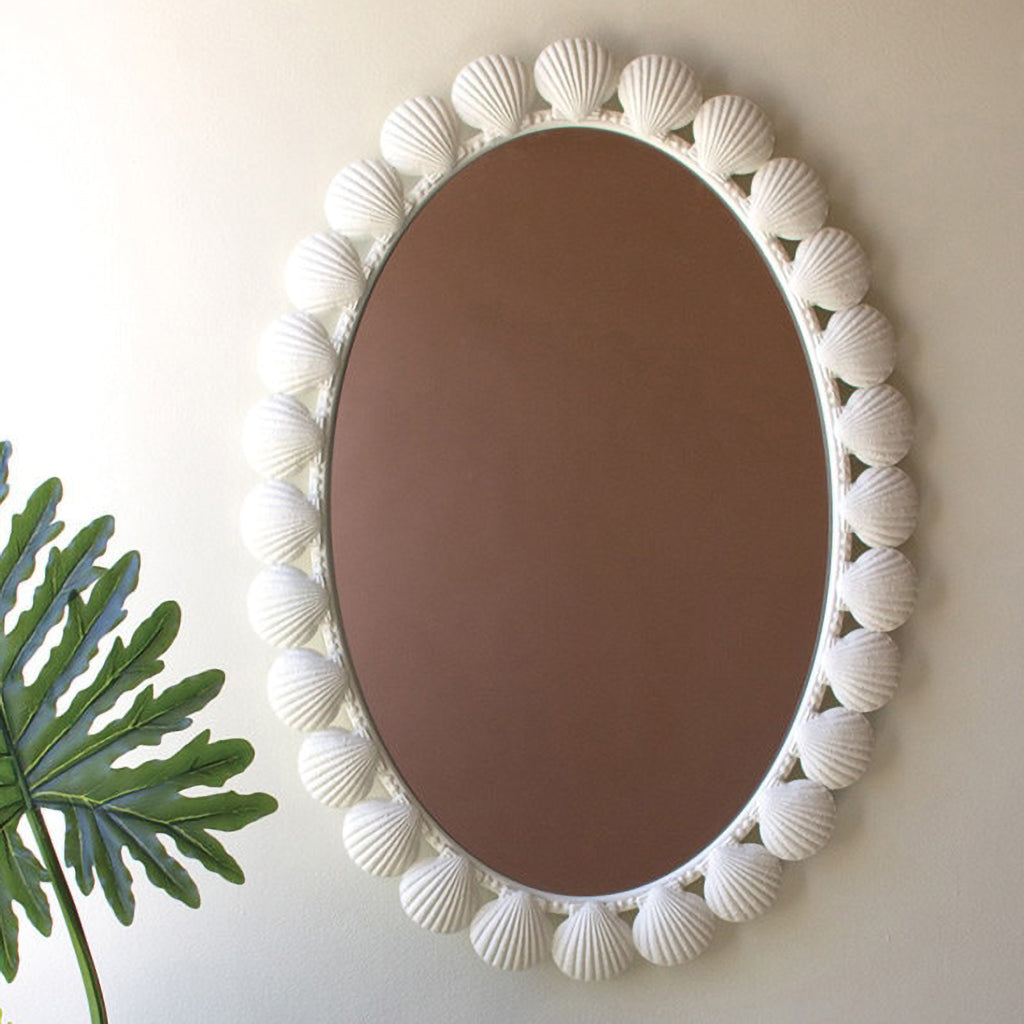 Coastal cabins are calling, and so is this metal shell-framed oval mirror. Perfect for the half-bath or other small space at the beach. The oval mirror is framed in white scallop shells.
