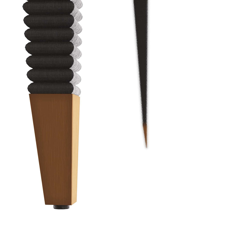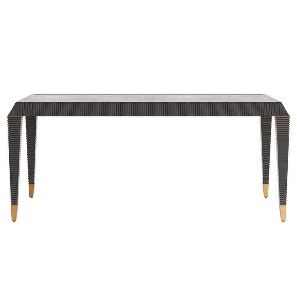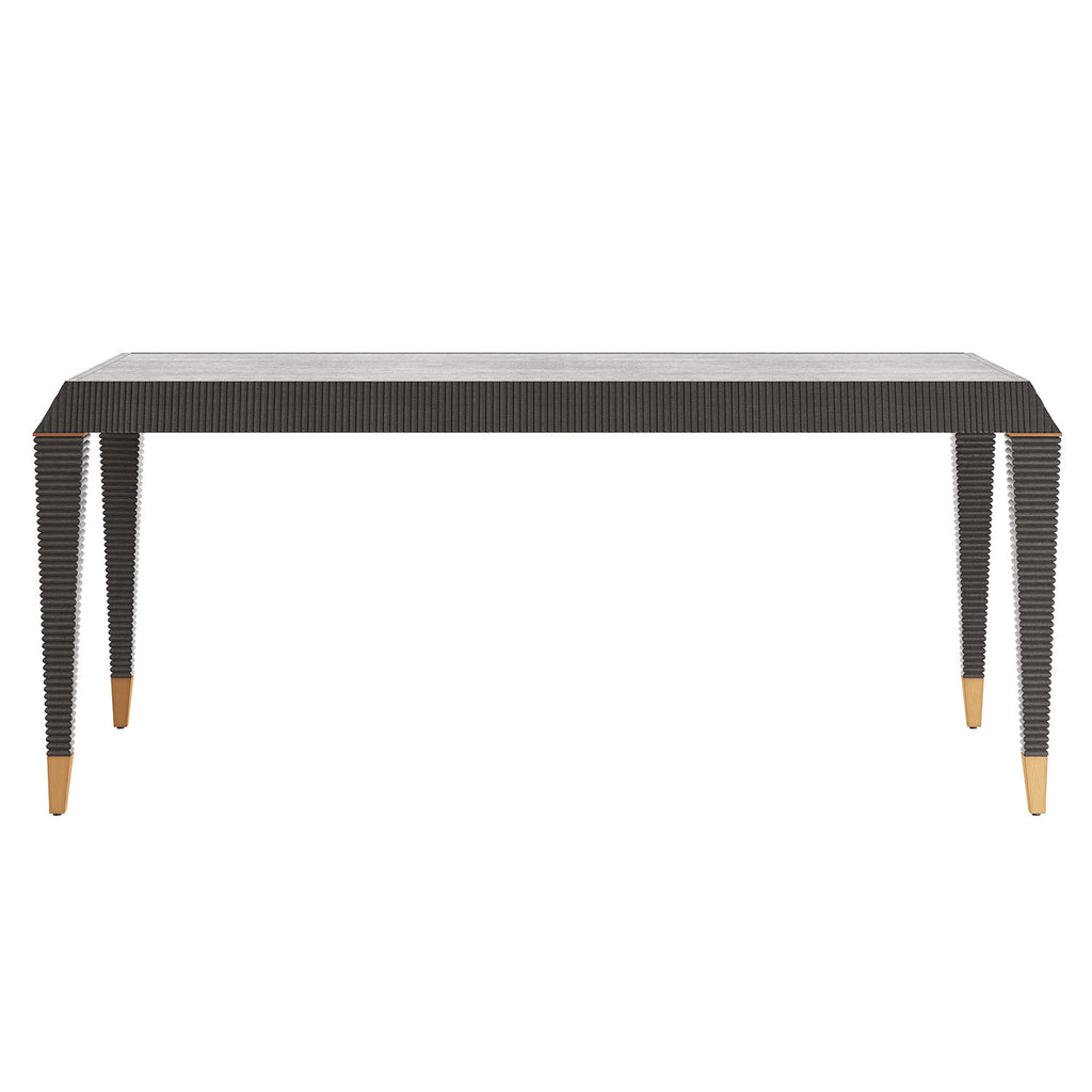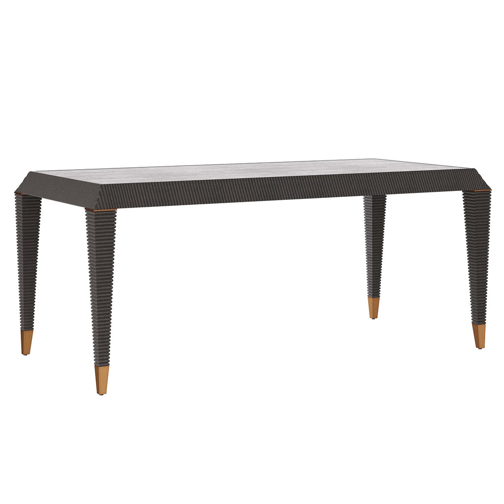 Reminiscent of italian furniture of the ’50s, the Arteriors Tristan dining table is conceived with a classic sensibility and an attention to artisan detail. The graceful, four-leg table is crafted in sable oak veneer with heavy, carved ribbing on the legs and on the tabletop apron. The table is accented with antique brass sabots. Finish will vary.