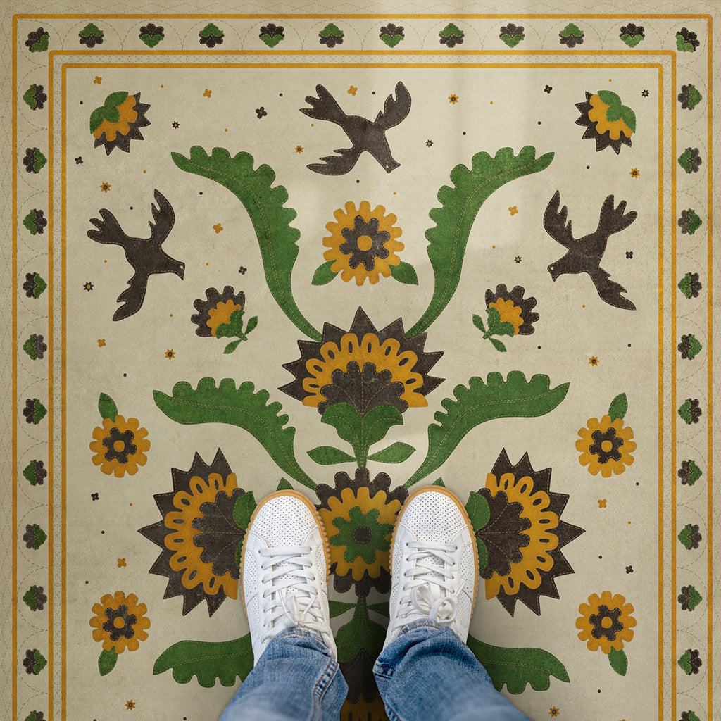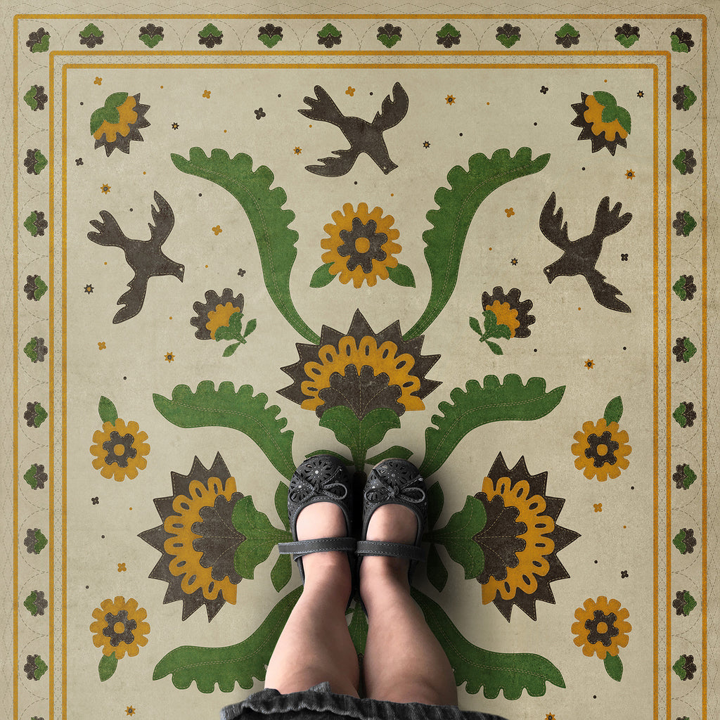 The Wild Bees Song vinyl floor cloth from the Williamsburg Applique collection was inspired by vintage linoleum. Perfect for kitchens, baths, screened in porches and patios, the durable vinyl floorcloths are easy to clean and always lay flat. Vinyl floorcloths are made with two-ply vinyl with latex padded backing, designed to be fade-resistant in direct sunlight and durable against the elements but work best in controlled outdoor environments.