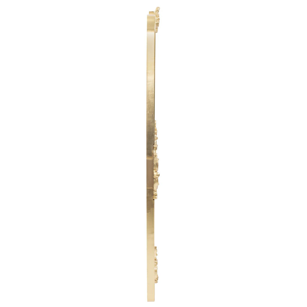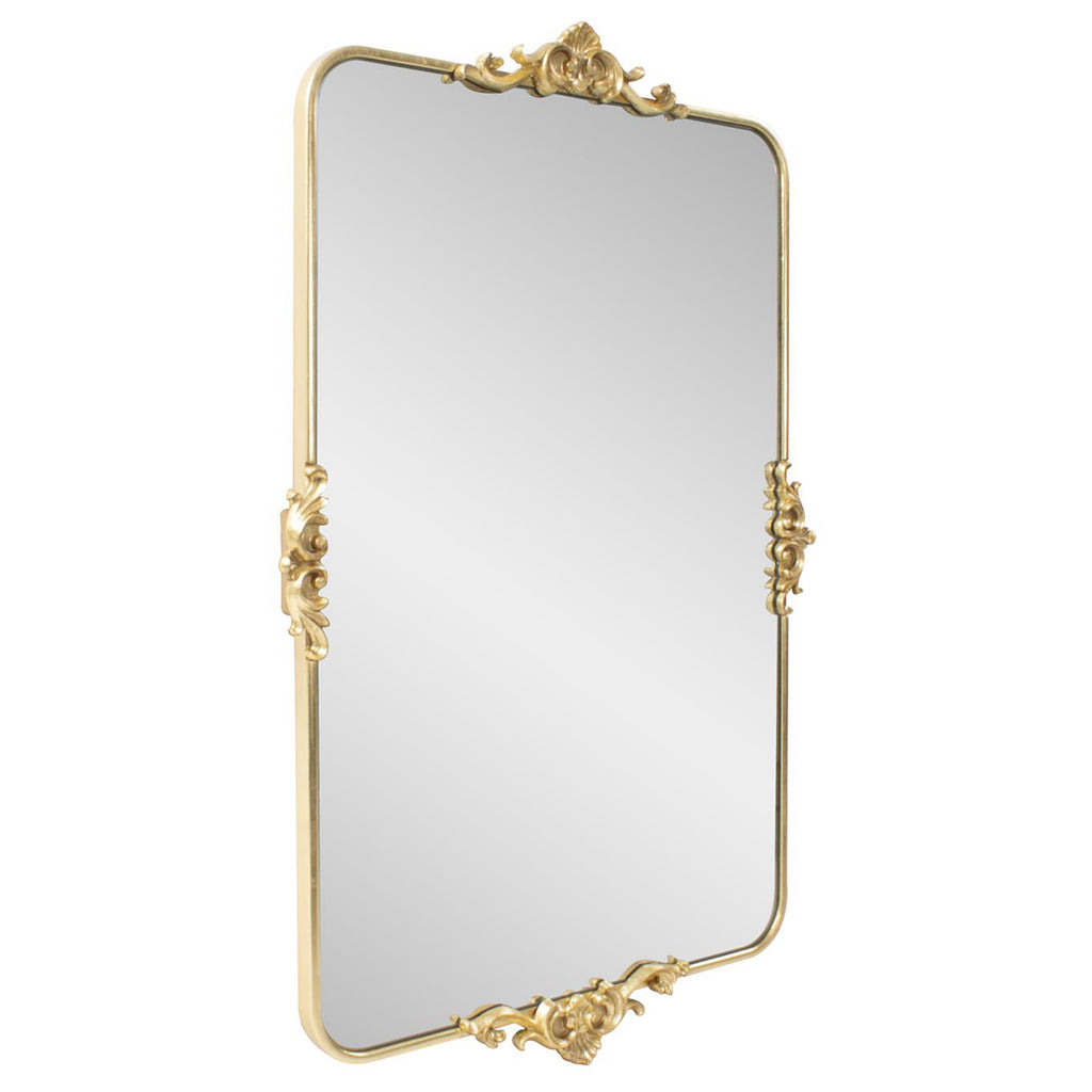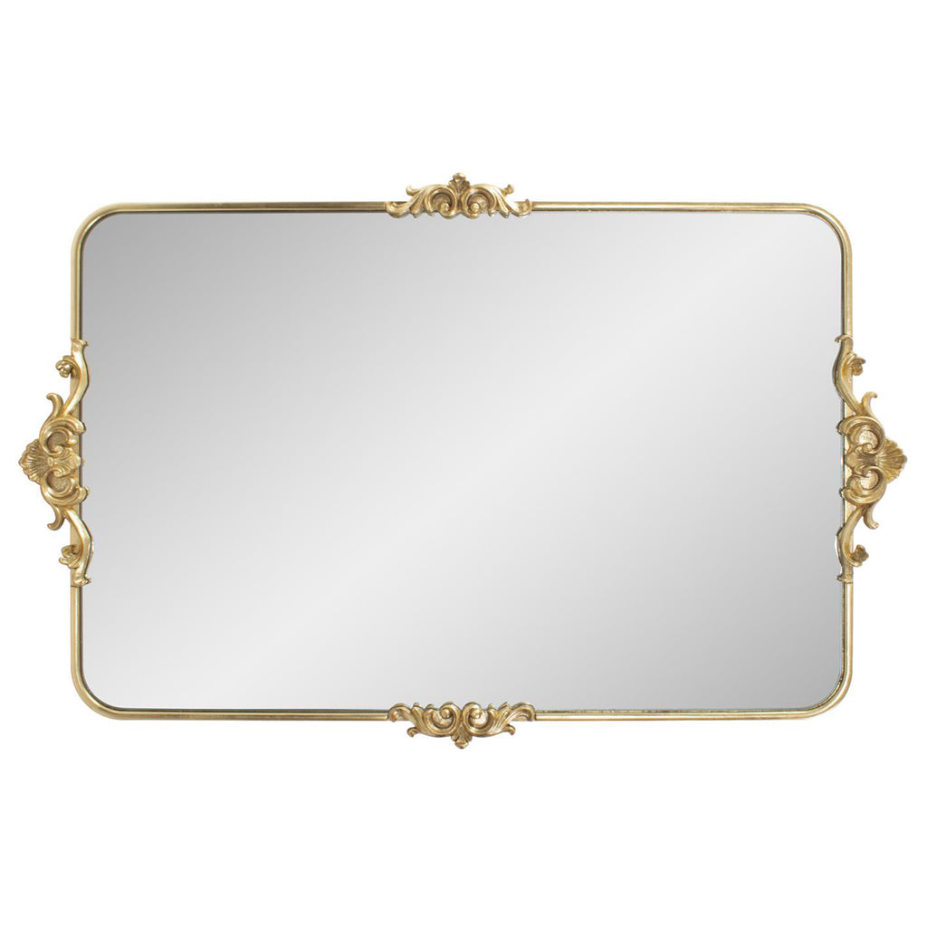 This mirror offers the versatility of being hung either horizontally or vertically, adapting effortlessly to your design preferences. Its rounded edges add a touch of softness and sophistication, a departure from traditional angular forms. The true masterpiece lies in the intricate motifs adorning all four sides, paying homage to the exquisite detailing of classic French mirrors. Encased in a resplendent gold leaf frame, this mirror becomes a radiant focal point that seamlessly marries the past and the present, inviting the essence of French antiquity into your modern living space.