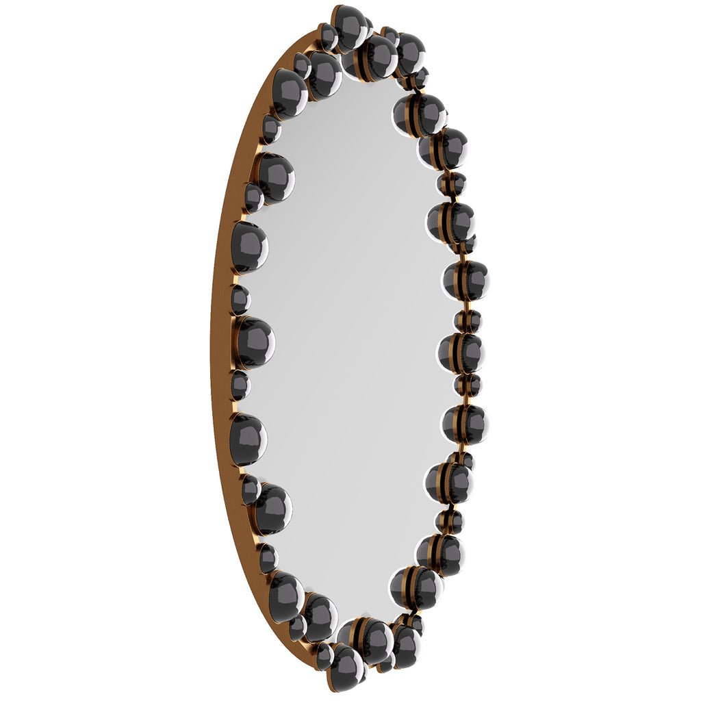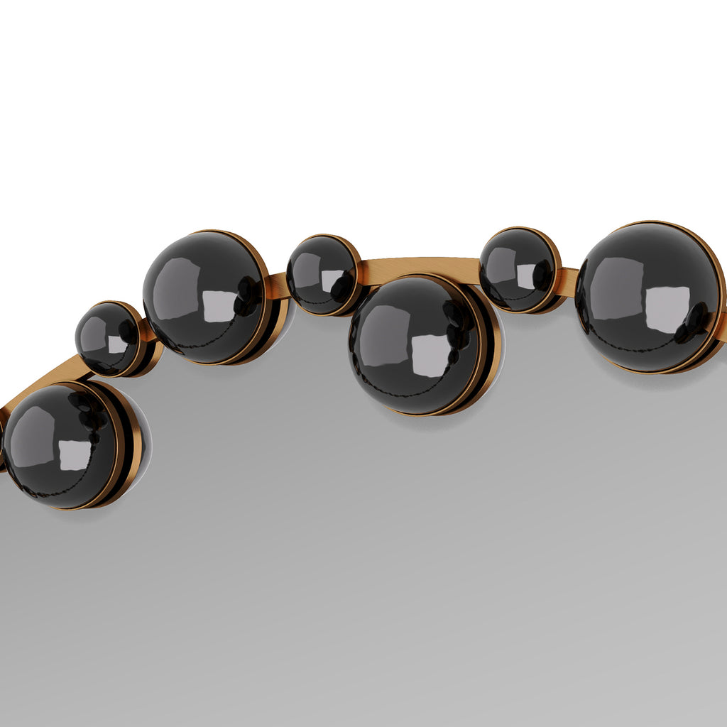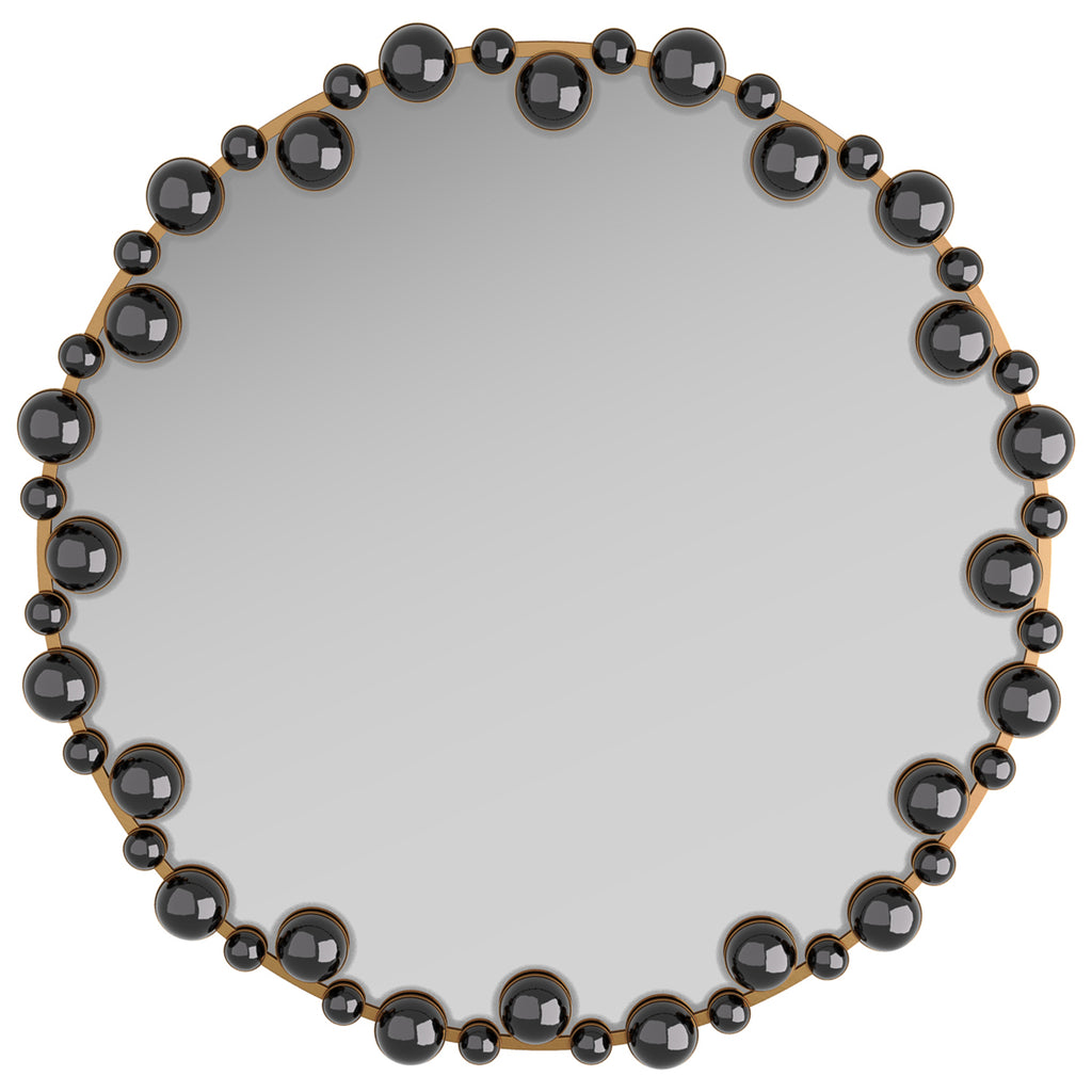 A playful mix of sophisticated materials and organic forms. Inspired by a jewelry setting, a roundel of black glass is encircled with effervescent dome-shaped spheres of varying sizes. Encased in an antique brass iron, it is fitted with a cleat for secure hanging. Finish will vary. Vertical only.