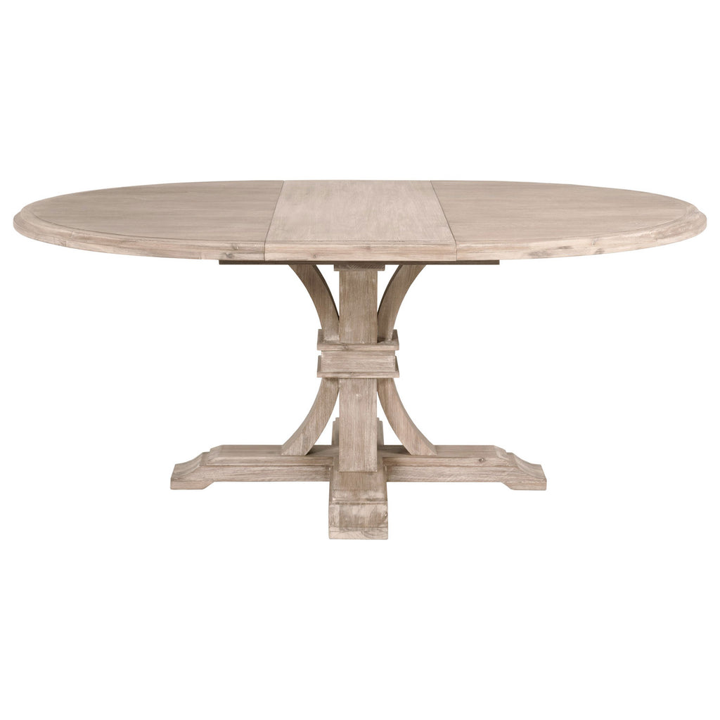 The Devon transitional style round extension dining table featuring Solid Acacia base and distressed Natural Gray finish. Tradition Collection' Acacia Veneer finish is sandblasted to create a rustic appearance. This process accentuates the natural grain of the wood and creates a variation in both color and texture. The existence of natural knots, cracks, scratches, and marks in the surface of the wood should be expected.
