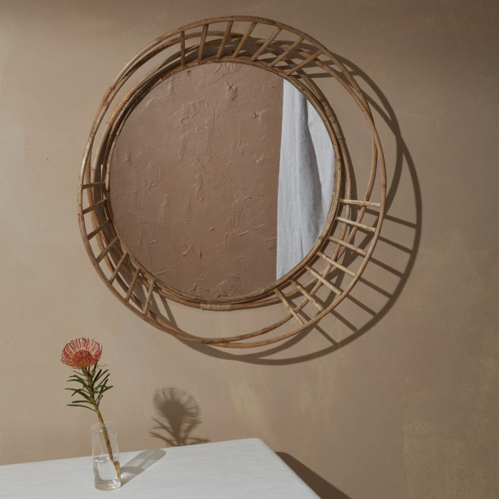 Give your walls a modern, geometric look with this small round rattan Oviedo Mirror. Trendy, easy to style & perfect for an entryway or walk-in closet, this piece is lovely layered with a floor plant or hanging basket for added warmth in your space.