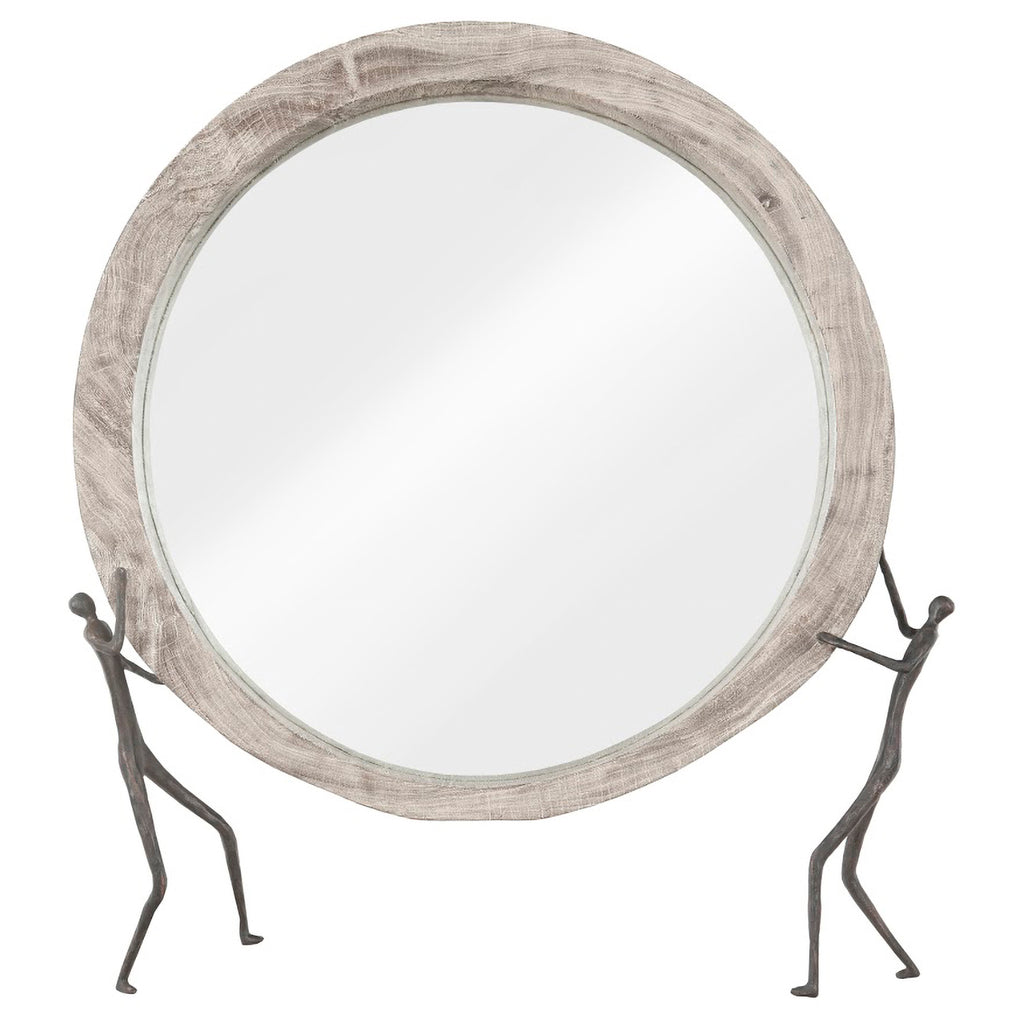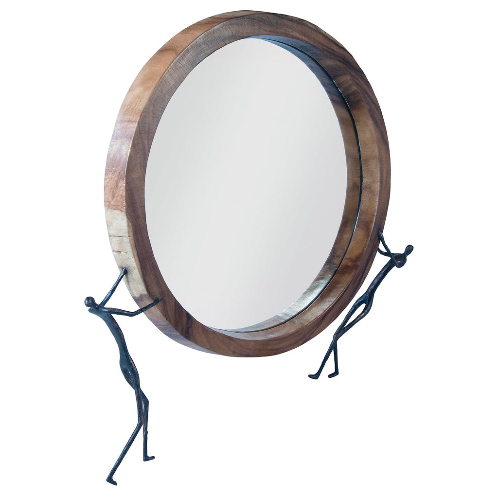The Atlas Gray Mirror is a round decorative mirror made of chamcha wood ornamented with whimsical metal figures in a bronze finish. The Atlas Collection, which reflects the ethos that Phillips Collection personifies—modern organic—has a storied namesake. In Greek mythology, Atlas was the Titan god of endurance whom Zeus tasked with holding up the celestial heavens for eternity. With exquisite craftsmanship, we have rescued the reclaimed chamcha wood top from being one of Nature’s finest castaways by making it into an elemental design statement.
