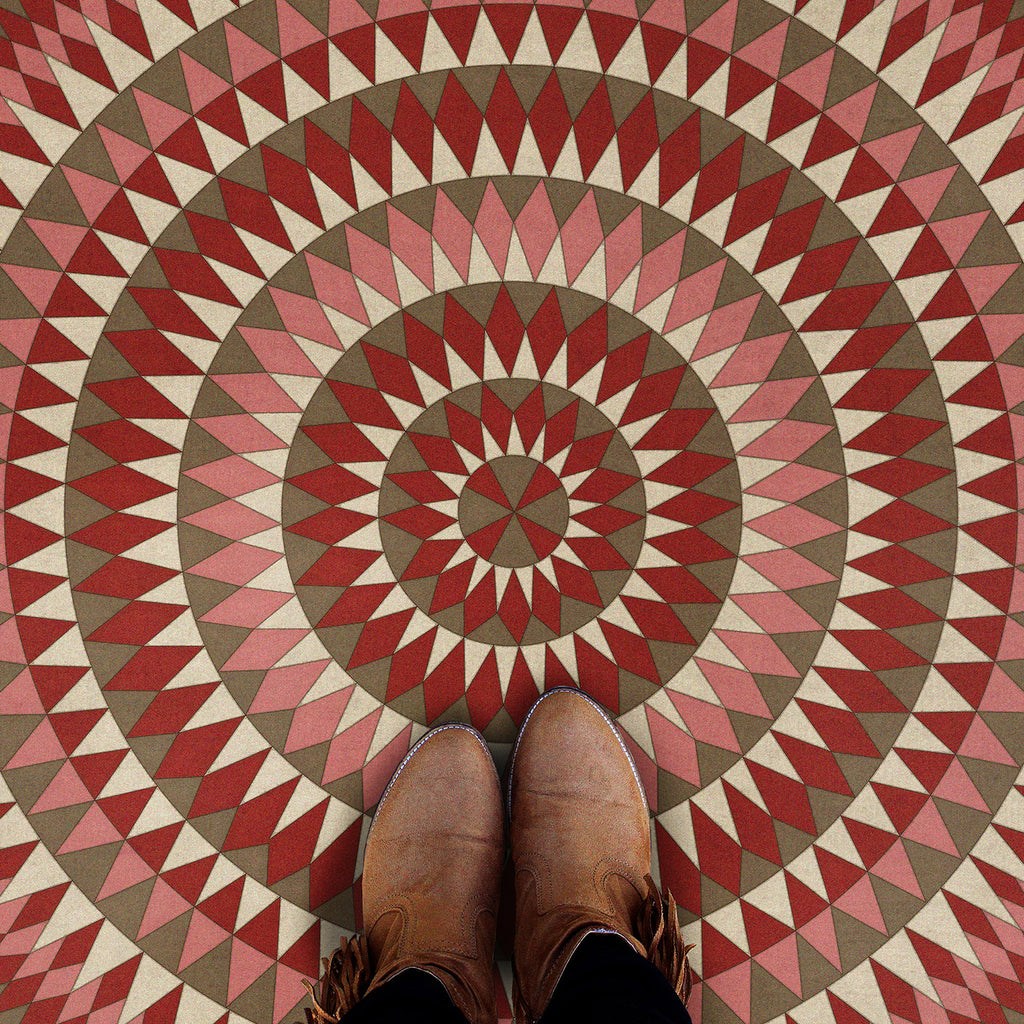 The Blaze Within Blaze vinyl floor cloth from the Folk Art Museum Bulls Eye collection was inspired by vintage linoleum. Perfect for kitchens, baths, screened in porches and patios, the durable vinyl floorcloths are easy to clean and always lay flat. Vinyl floorcloths are made with two-ply vinyl with latex padded backing, designed to be fade-resistant in direct sunlight and durable against the elements but work best in controlled outdoor environments.