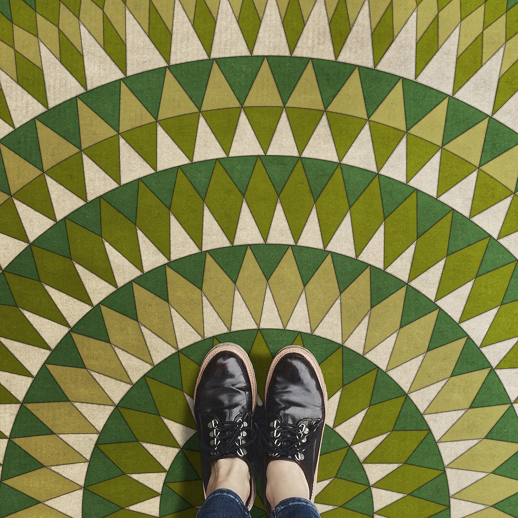 The Forever Outward vinyl floor cloth from the Folk Art Museum Bulls Eye collection was inspired by vintage linoleum. Perfect for kitchens, baths, screened in porches and patios, the durable vinyl floorcloths are easy to clean and always lay flat. Vinyl floorcloths are made with two-ply vinyl with latex padded backing, designed to be fade-resistant in direct sunlight and durable against the elements but work best in controlled outdoor environments.