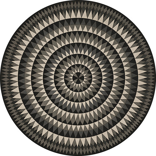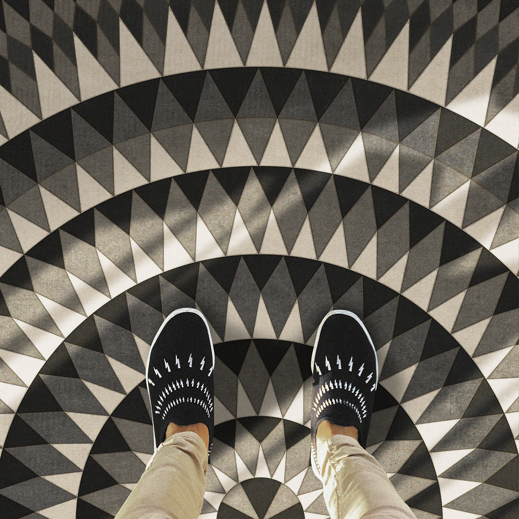 The Undeviating Aim vinyl floor cloth from the Folk Art Museum Bulls Eye collection was inspired by vintage linoleum. Perfect for kitchens, baths, screened in porches and patios, the durable vinyl floorcloths are easy to clean and always lay flat. Vinyl floorcloths are made with two-ply vinyl with latex padded backing, designed to be fade-resistant in direct sunlight and durable against the elements but work best in controlled outdoor environments.