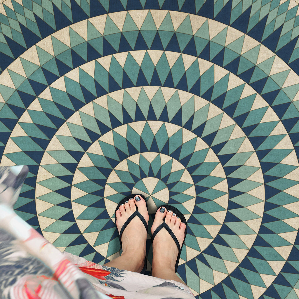 The Vaulted Wonder vinyl floor cloth from the Folk Art Museum Bulls Eye collection was inspired by vintage linoleum. Perfect for kitchens, baths, screened in porches and patios, the durable vinyl floorcloths are easy to clean and always lay flat. Vinyl floorcloths are made with two-ply vinyl with latex padded backing, designed to be fade-resistant in direct sunlight and durable against the elements but work best in controlled outdoor environments.
