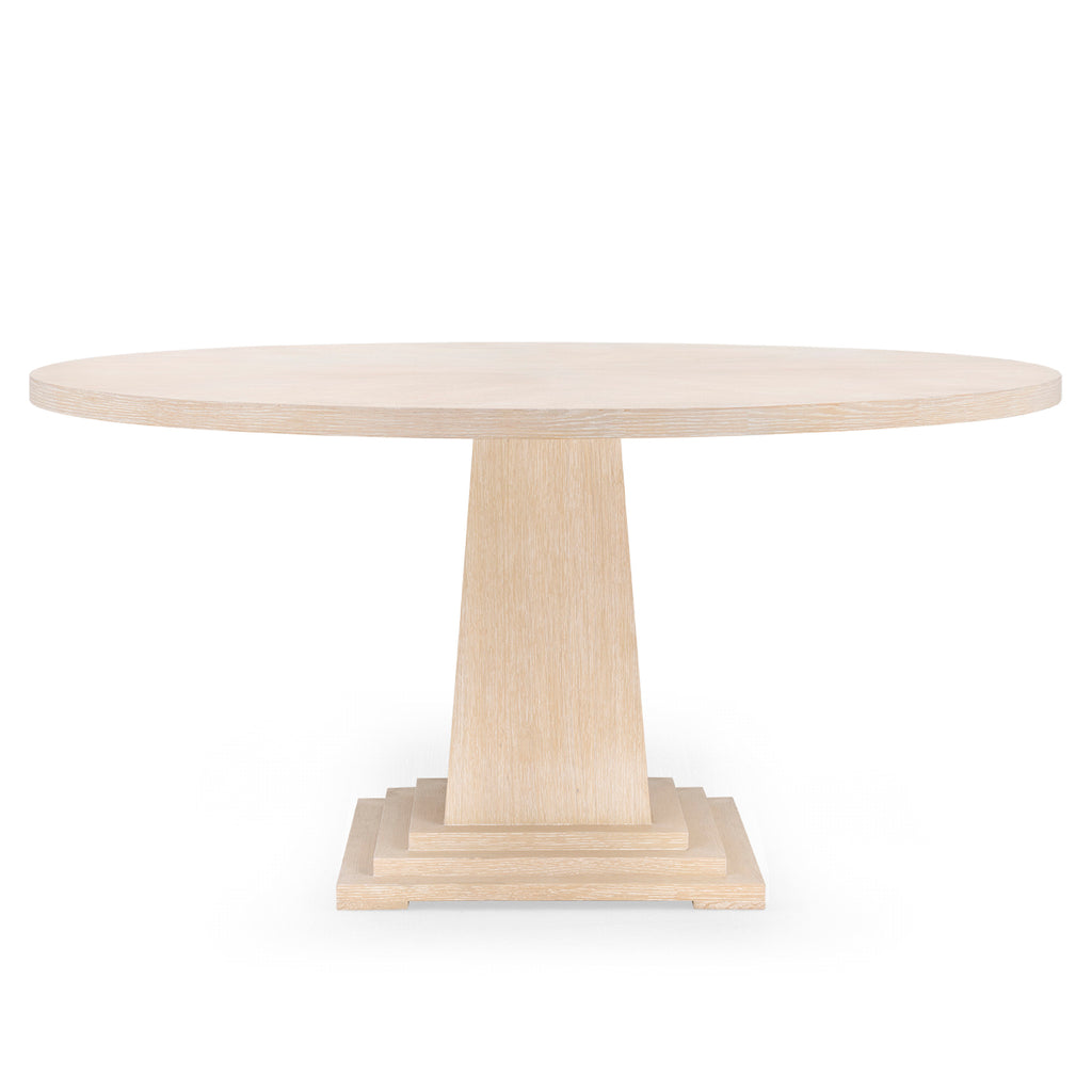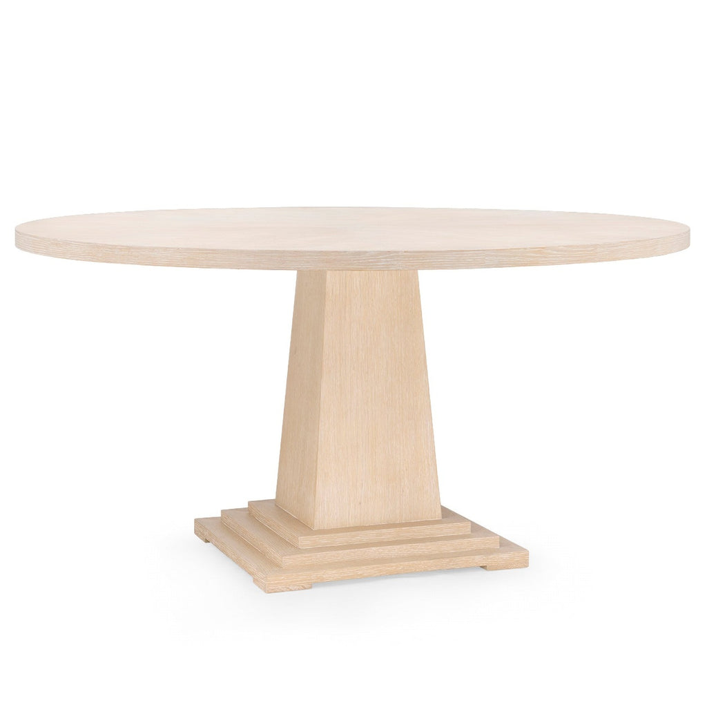 The Breanna Dining Table is a modern classic dressed in Bleached Cerused Oak. This deco inspired piece exudes stately sophistication, featuring a rounded tabletop supported by a single column resting on a graduated platform base. With its simple and clean design, it's the perfect addition to any contemporary or traditional dining space.