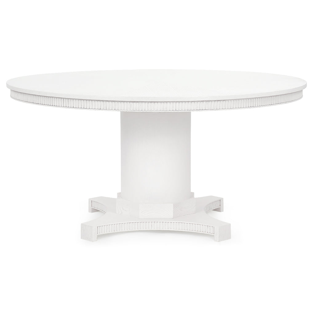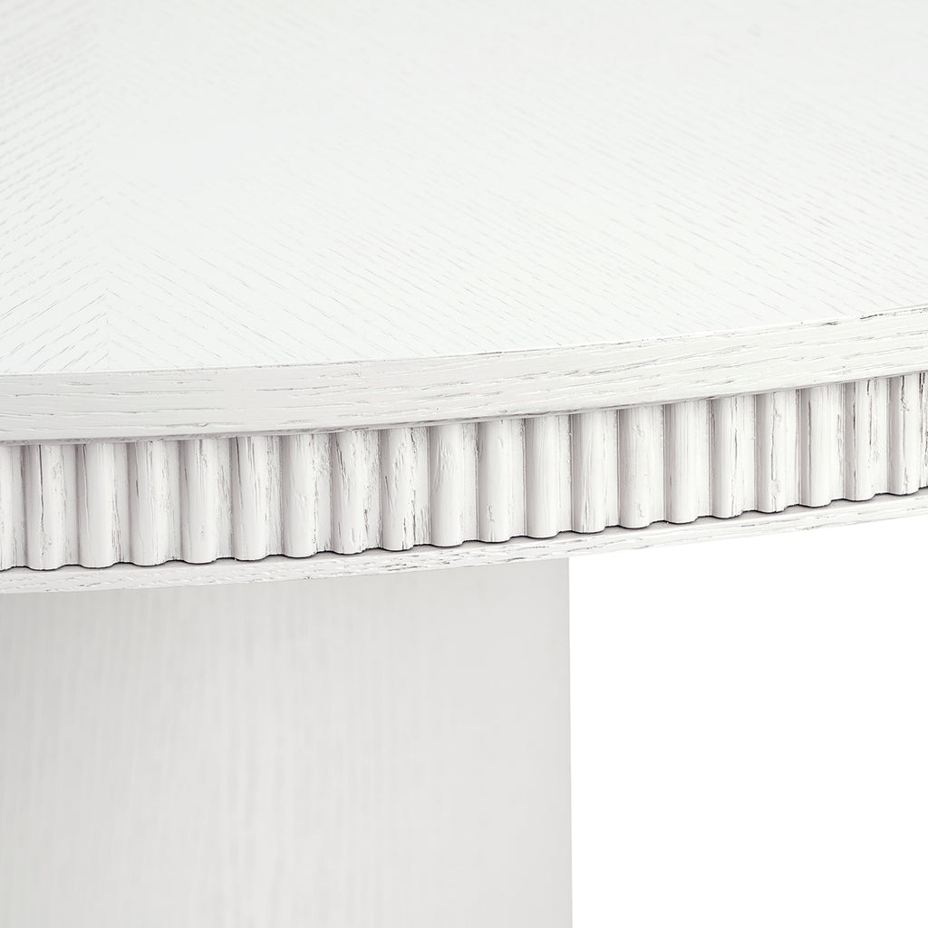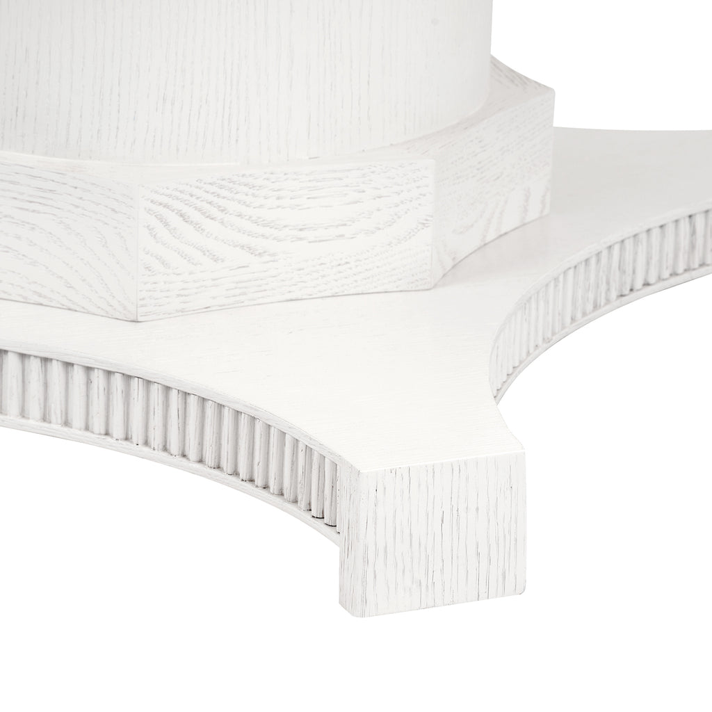 The Villa and House Kinsley Dining Table is a masterful blend of bold proportions and timeless elegance. Crafted from oak, its round silhouette features grooved details on the apron and base. The subtly neo-classical shape strikes the perfect balance between traditional craftsmanship and modern versatility. The curved octagonal detailing around the base of the central column is a standout feature, adding a touch of architectural refinement. Finished to highlight the natural oak grain with a lustrous white sheen, this table exudes sophistication. It is equally at home in traditional, contemporary, or transitional interiors, making the Kinsey Dining Table a versatile centerpiece that enhances any dining space.