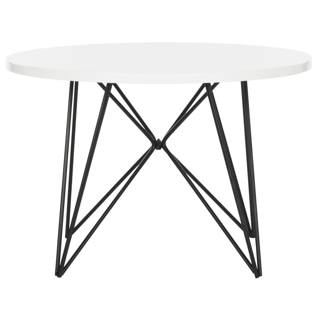 This end table beautifully reinterprets retro Mid-Century style for today’s sophisticated interiors. Crafted of smooth wood in a clean white lacquer or neutral light brown finish, the black iron hairpin legs give any decor a sense of depth and movement with its angled geometry and negative space.