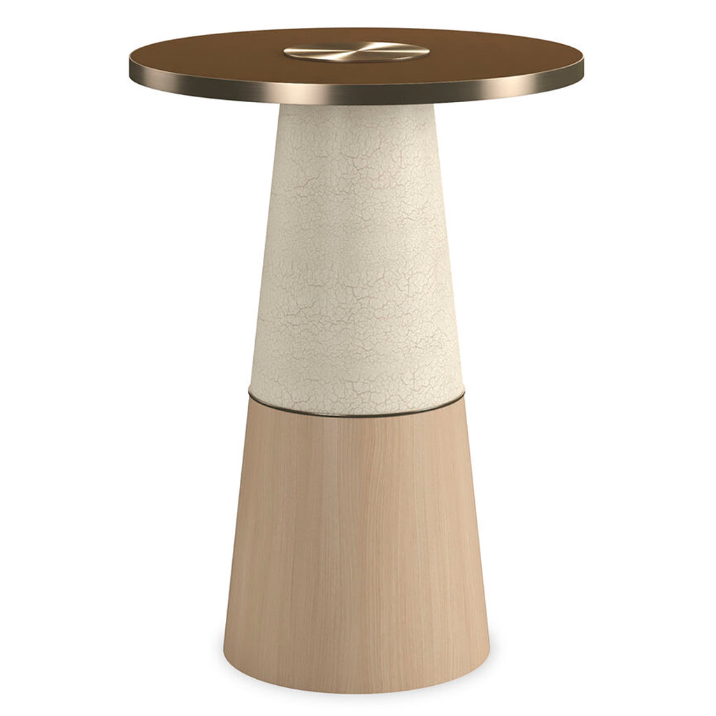 This go-anywhere spot table features a sleek silhouette and top-down view that resembles the aperture of a camera. A Forest Craze crackle finish adds depth and elemental beauty, complemented by an inset smoked bronze glass top with a metallic band and center disc in Brushed Gold. Style between two chairs to create composition and a unique focal feature.