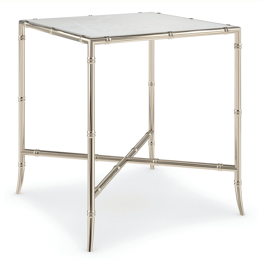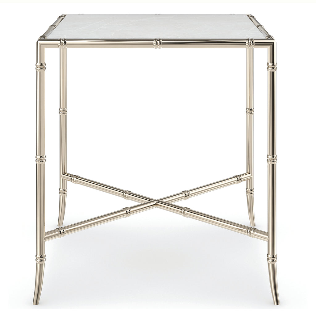 This simple yet elegant accent table beautifully blends modern materials with traditional Asian design influences. A luxe landing for a beverage or book, it features a Carrara white marble top, elevated on a faux bamboo metal frame and stretcher finished in a Whisper of Gold. Style on its own, or pair with our Ceylon Tall nesting table to add an easily accessible extra table when guests arrive.