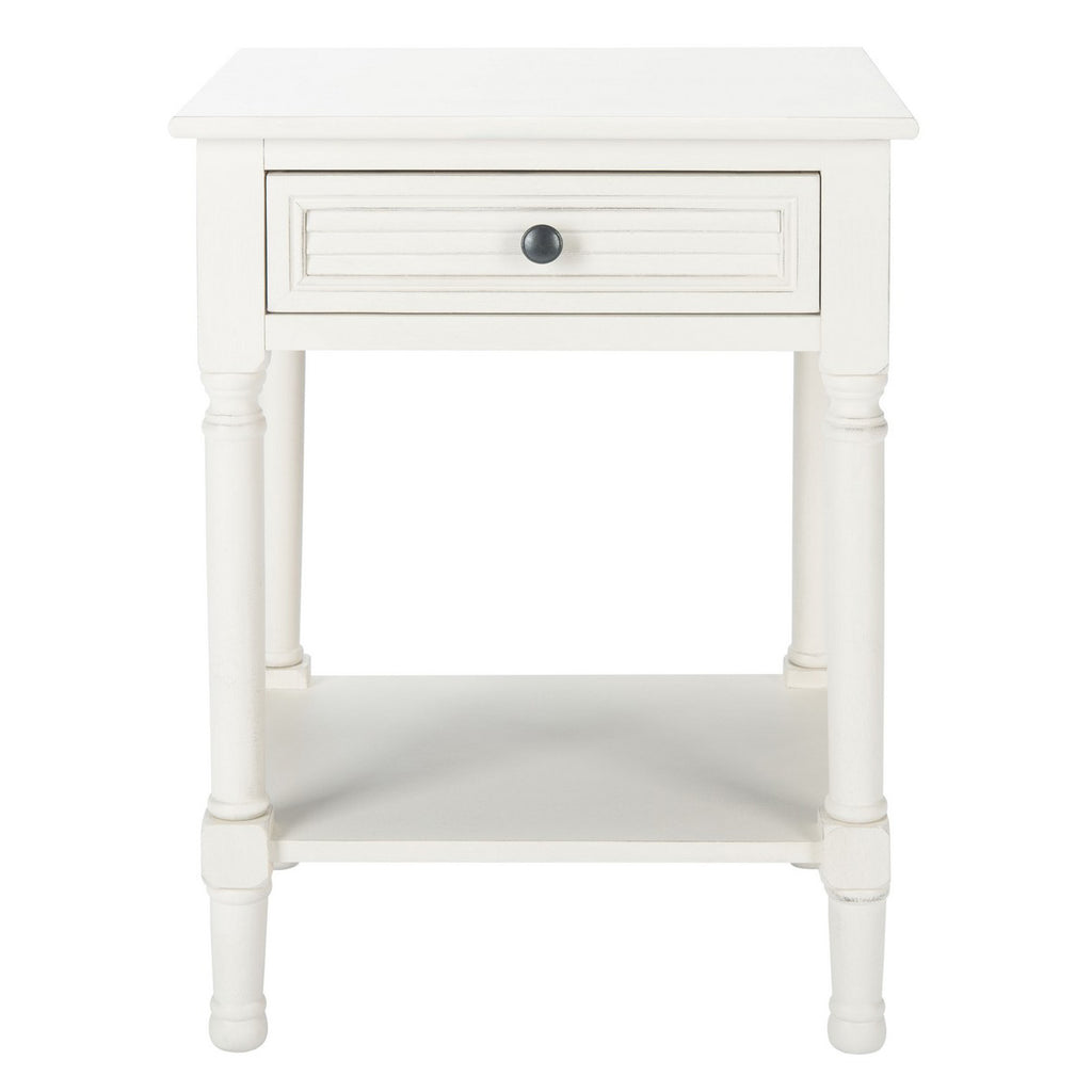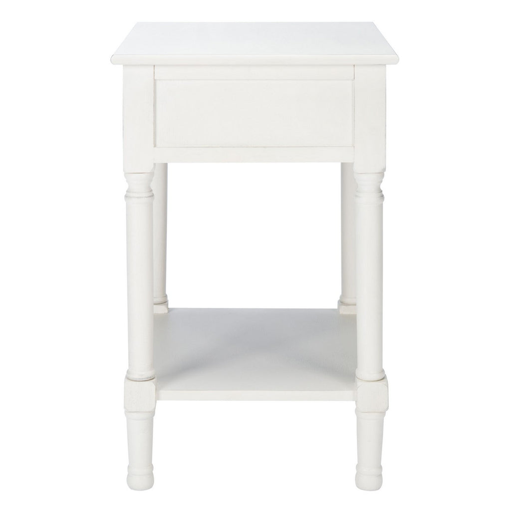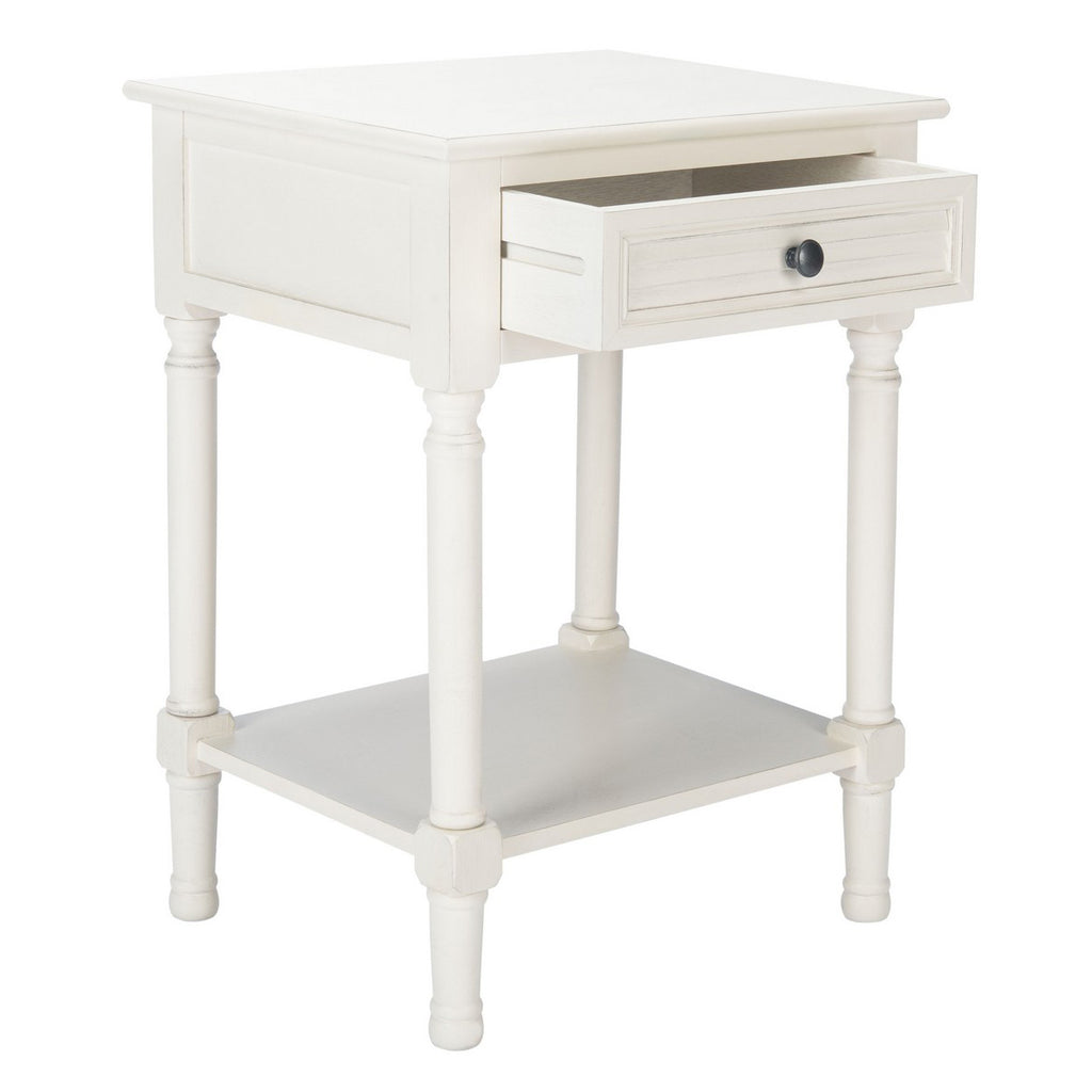 Give your classic contemporary décor a timeless touch of tradition with this accent table. The finely sculpted turned legs and carved details are treated to a modern farmhouse upgrade with the liner pattern on its single drawer and distressed white finish.