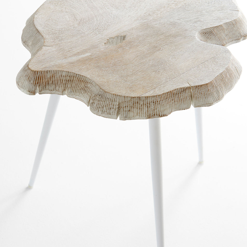 On-trend with the latest in decor, the Palmer side table dons a distinctive shape and natural allure. The sleek iron legs support a white finished, robust live edge cross-section of an Ardu tree trunk. The Palmer side table is a statement piece fit for any application in any bedroom, office, living room, entryway, or commercial living space. Hand carved | Hand-applied Finish | Carved from Ardu Wood