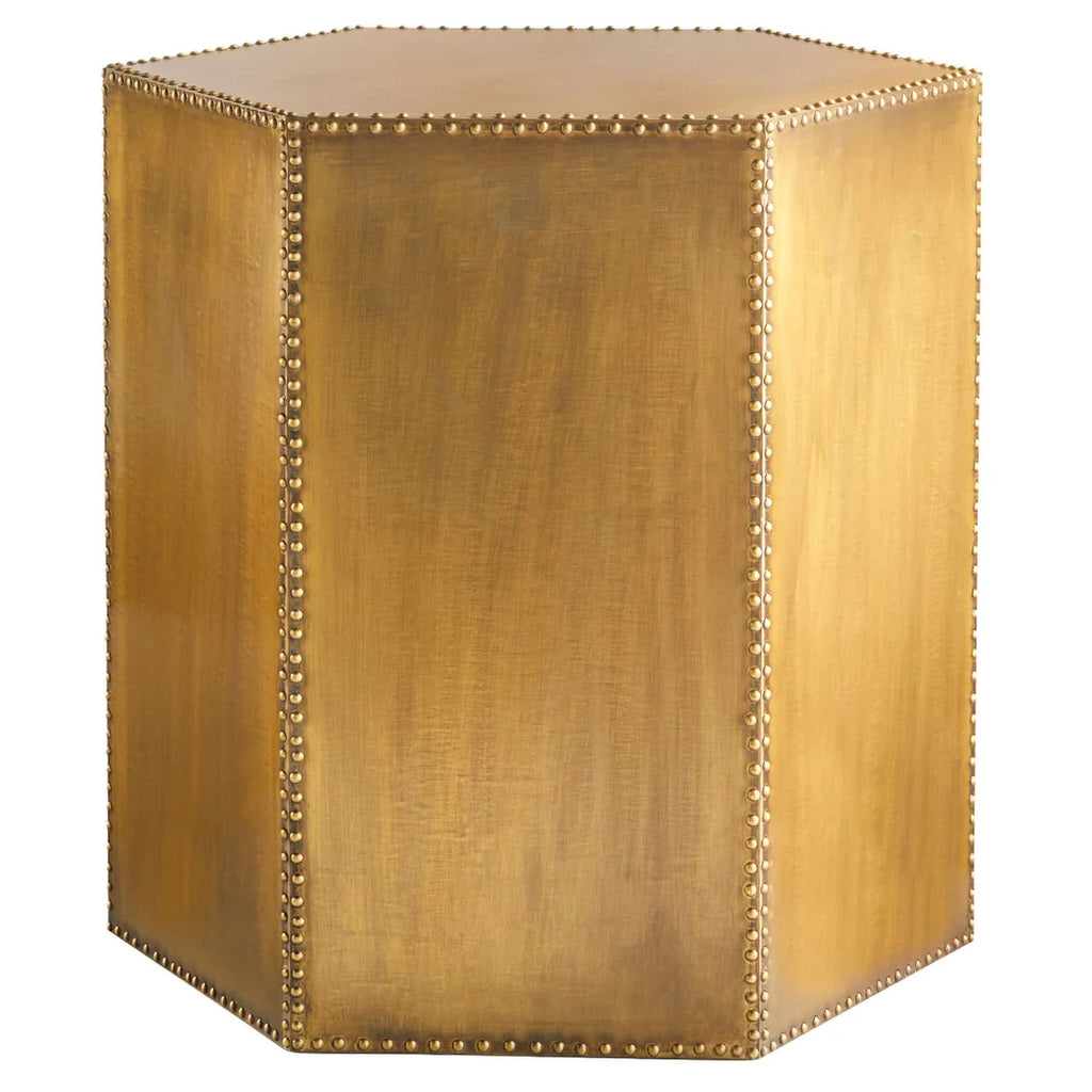 The Korio, or “honeycomb,” bunching table depicts the principles of geometry in form. With a hexagonal prism contour, the Korio table is best displayed in multiples to create the classic honeycomb shape. Brass sheet cladding is hammered by hand with miniature nailhead detailing, giving the table a stately overture.