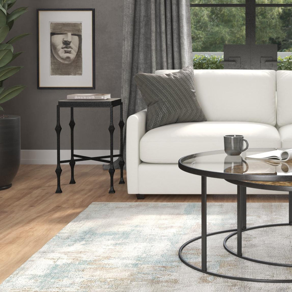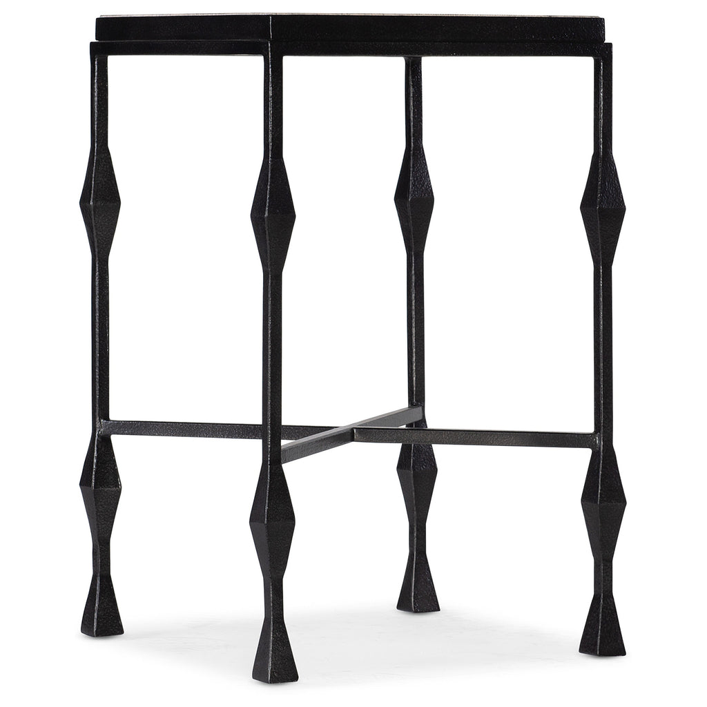 Globally inspired, the Commerce & Market Side Table combines a white Travertine Stone top in a screen-printed diamond pattern with a lightly-scaled black metal base with shaped legs.