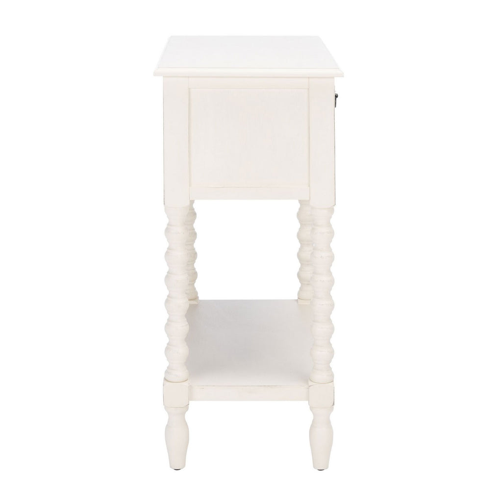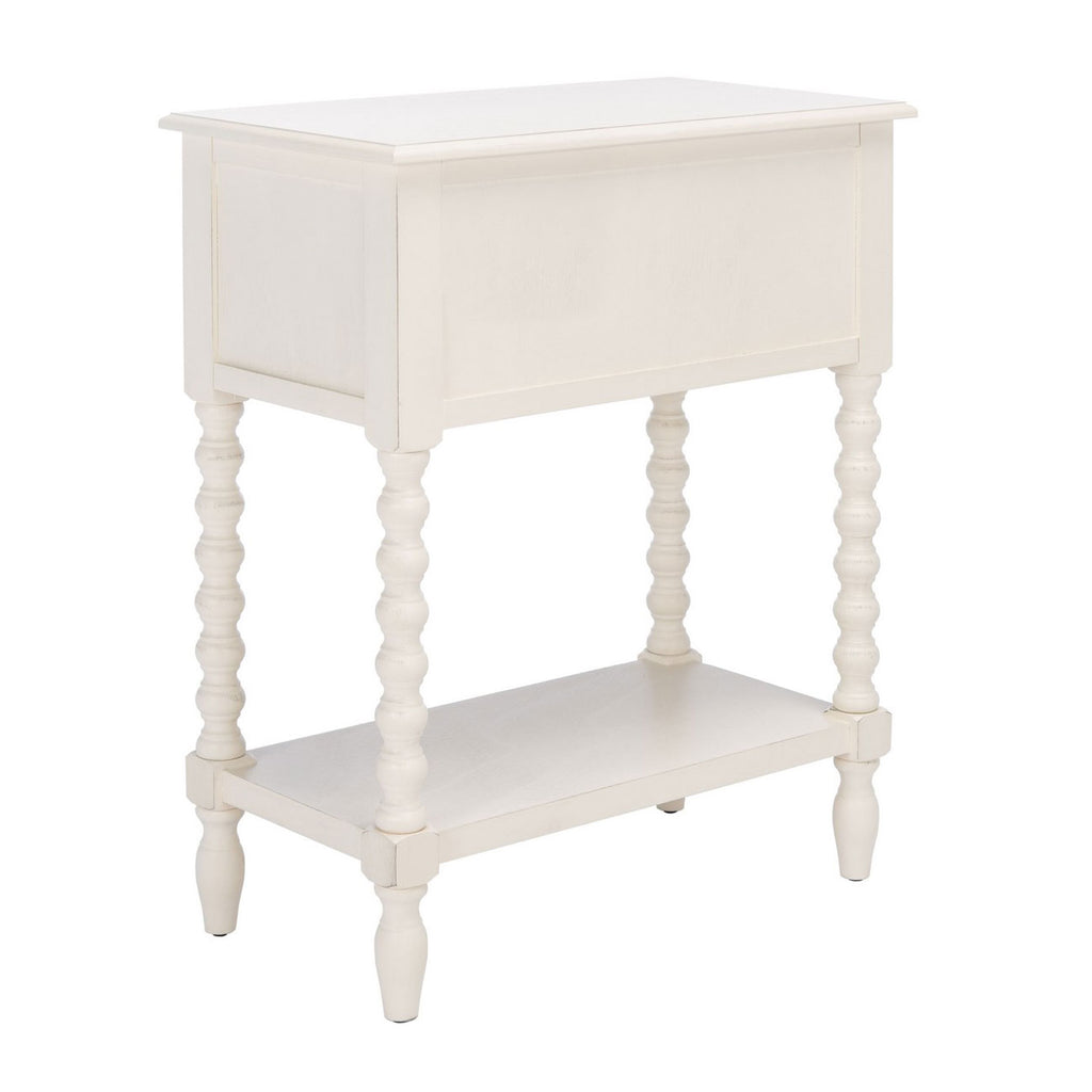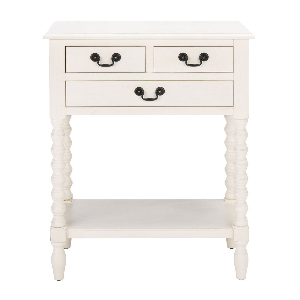Bring farmhouse charm to any classic contemporary décor with this side table. The modernized ball turned legs are beautifully highlighted by its distressed white finish, while an open bottom shelf and three slim drawers provide ample storage and display space.