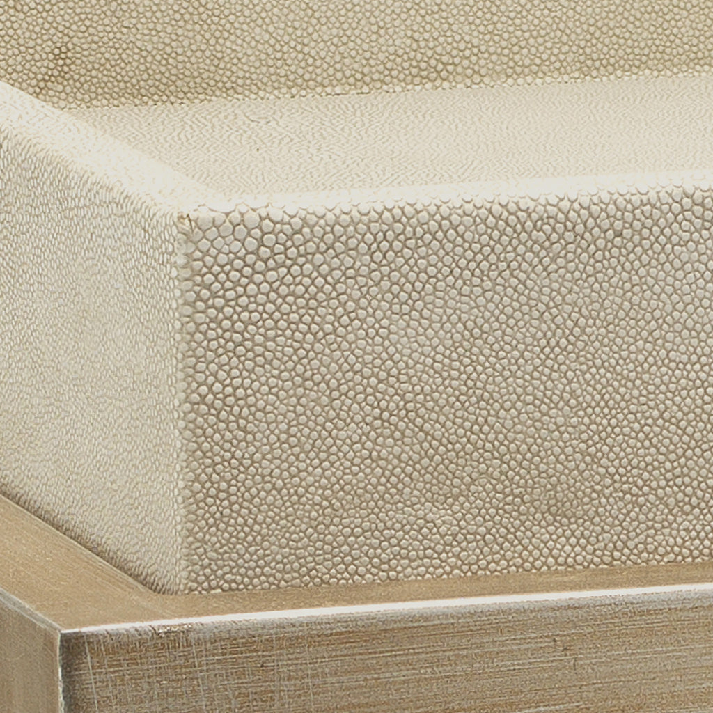 The exotic and modern texture of stingray skin o shagreen has been a favorite of designers since the 30's. the tray style topped side table has been upholstered in ivory faux shagreen and set in a champagne plated steel base set in a nickel plated steel base.