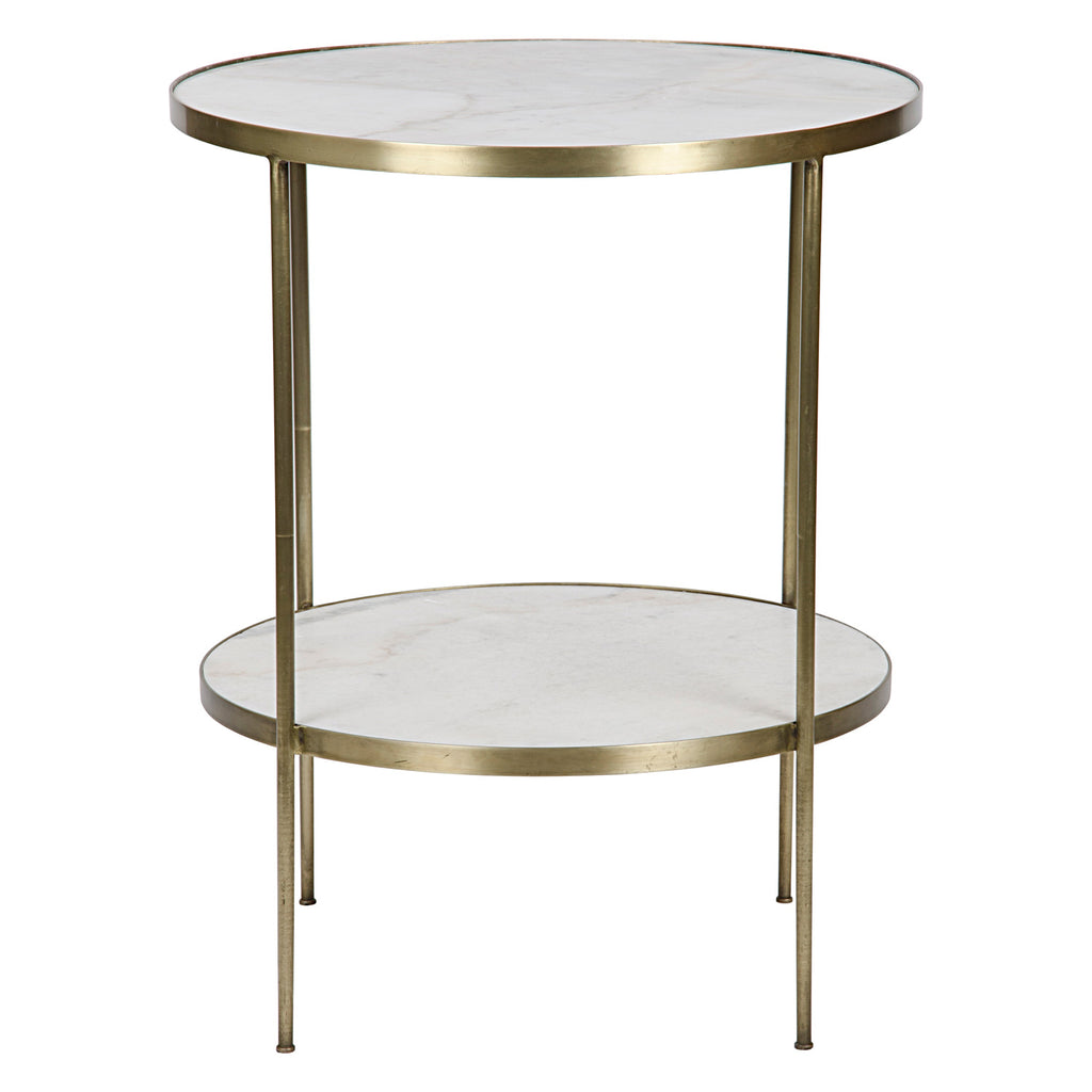 This elegant Noir table accents living rooms and bedrooms with contemporary function. Versatile to match a variety of aesthetics, this furnishing adds style to any space. Circular slabs of natural quartz are held aloft by delicate bands of softly burnished metal in this simple side table that embraces the beauty of its materials. No two pieces of quartz, and therefore no two tables, will be identical.
