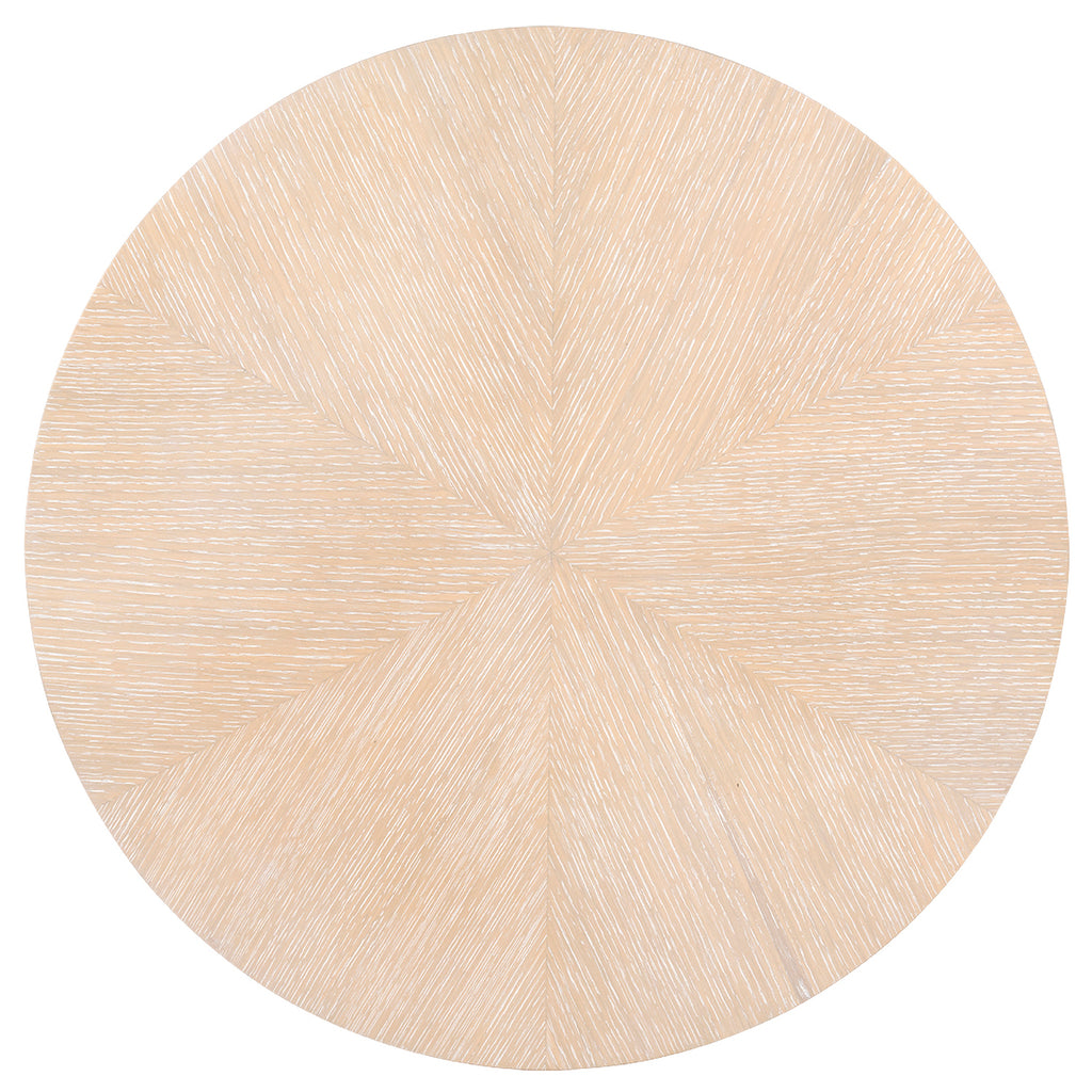 The Breanna Accent Table is a modern classic dressed in Bleached Cerused Oak. This deco inspired piece exudes sophistication, featuring a rounded tabletop supported by a single column resting on a graduated platform base. With its simple and clean design, it's the perfect addition to any contemporary or traditional living space.