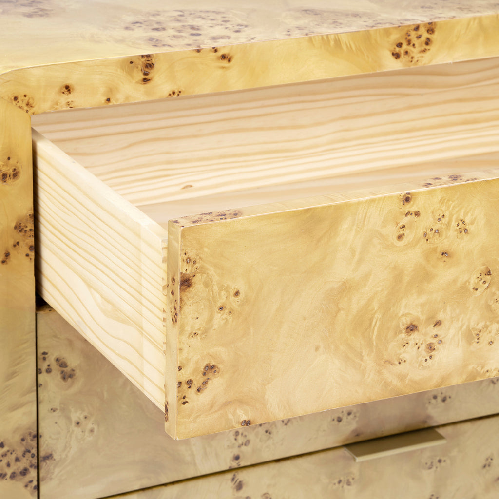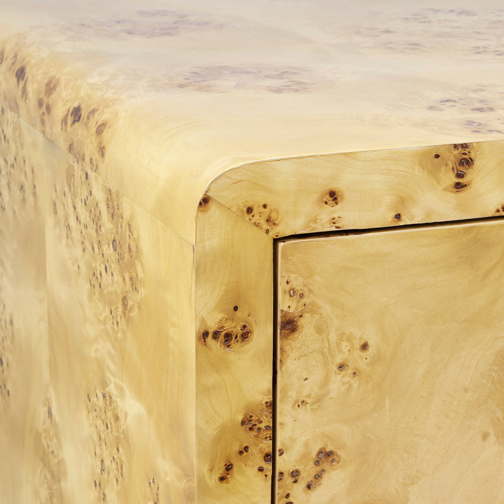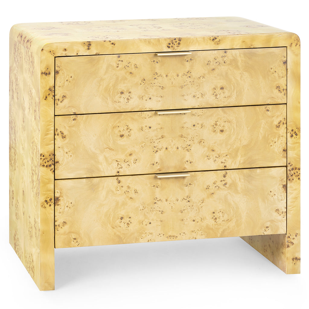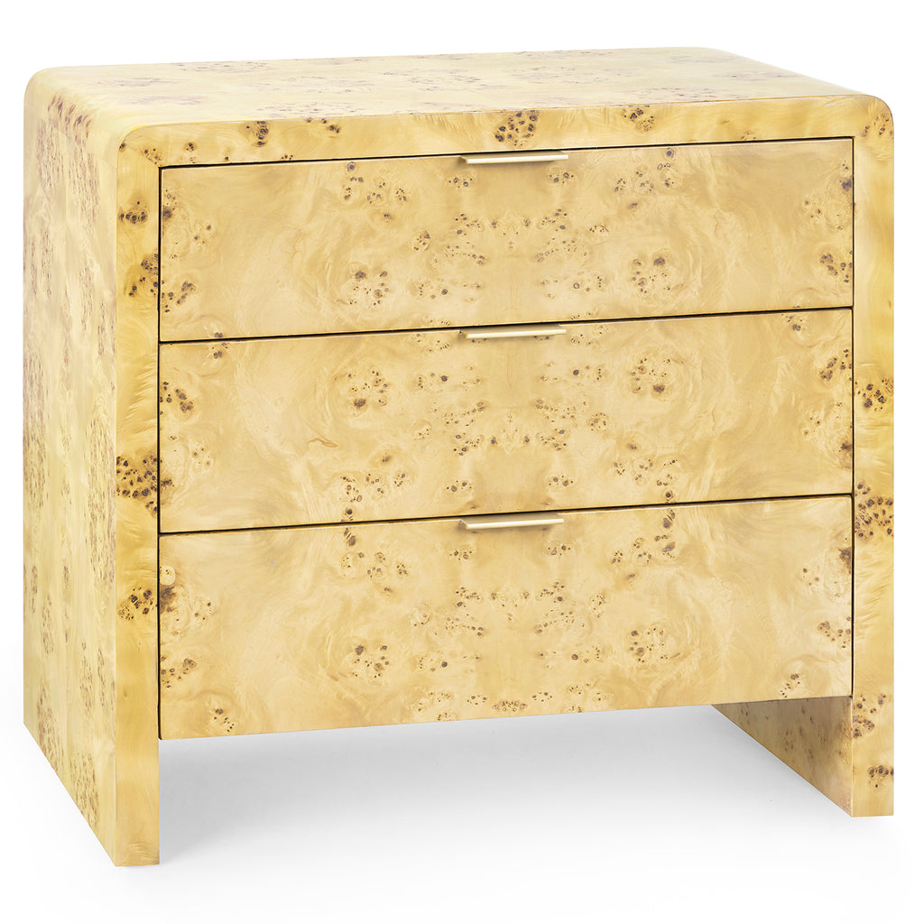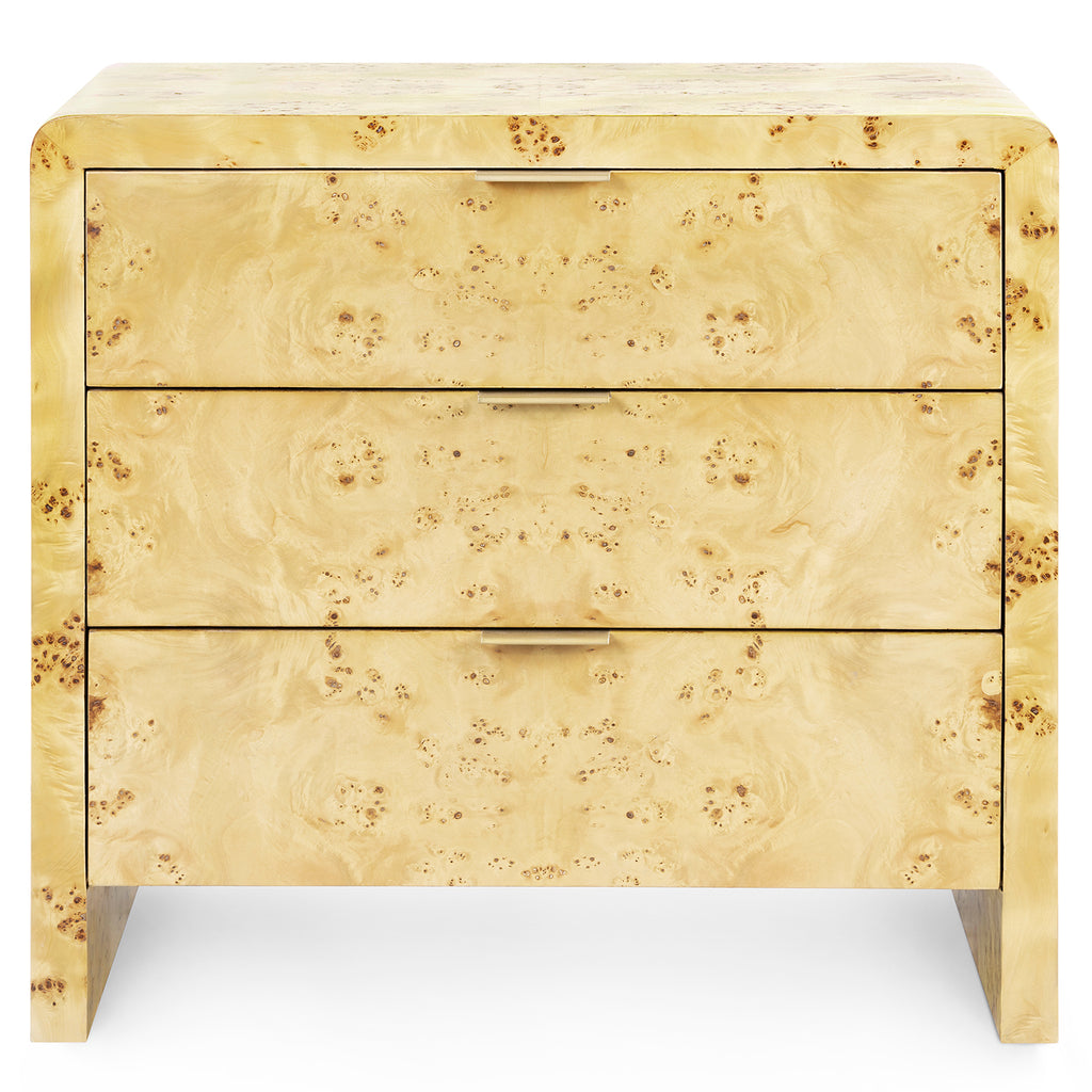 We love our Villa and House Emil Collection for its embrace of retro silhouettes and cosmopolitan style. The naturally vibrant patterns found in burl wood have a distinctively 1970s feel—all kaleidoscopic swirls with a bold sense of cool. Our Emil 3-Drawer is a masterful reinterpretation of the beloved vintage waterfall table style. Its seamless, curved design effortlessly channels the spirit of the era. The silhouette gracefully accommodates three spacious drawers adorned with brushed brass edge pulls, striking the perfect balance between vintage aesthetic and optimal storage functionality. Whether gracing the bedside as captivating nightstands or commanding attention as an exquisite accent table in a living room or office, the Emil 3-Drawer is a statement of refined sophistication, an embodiment of enduring style.