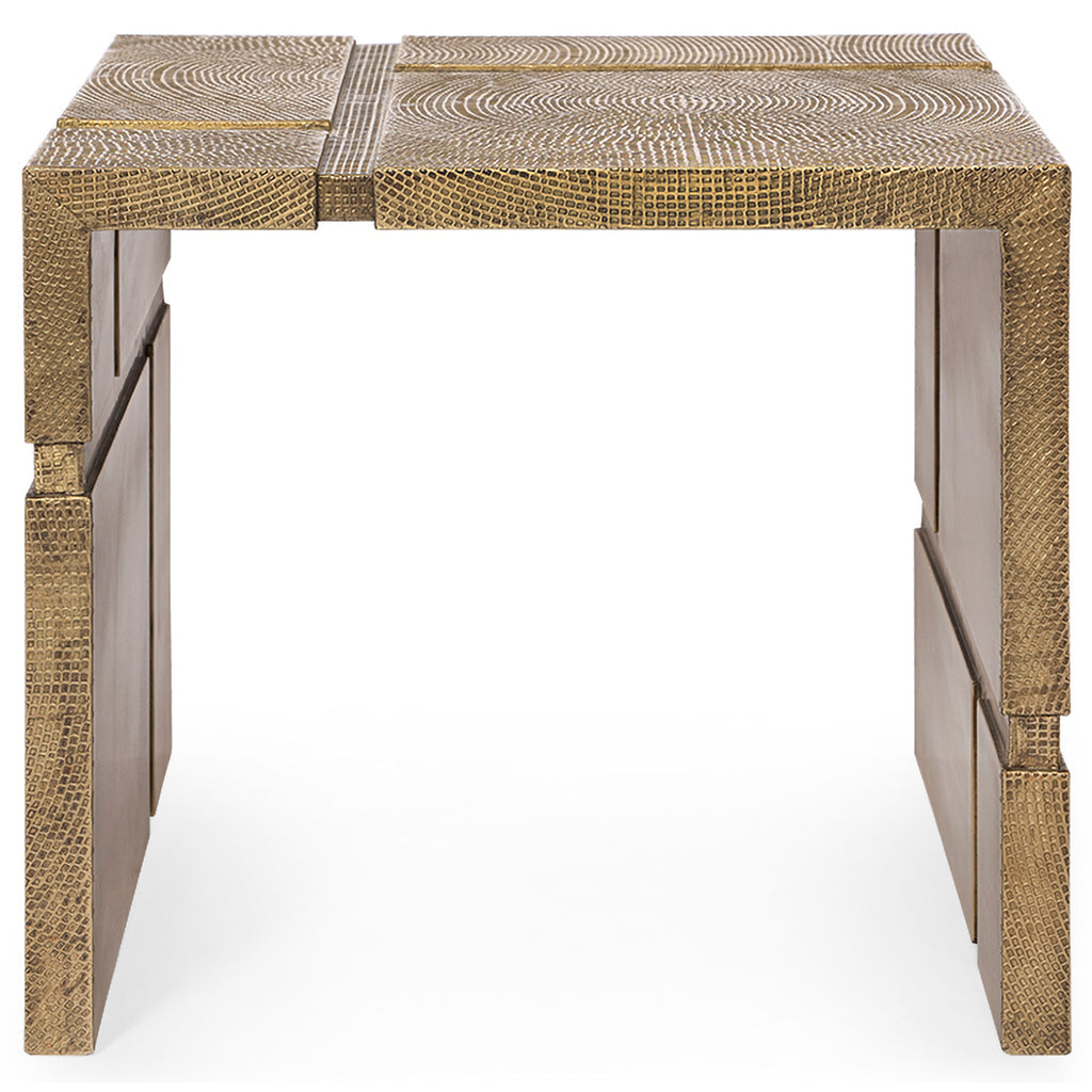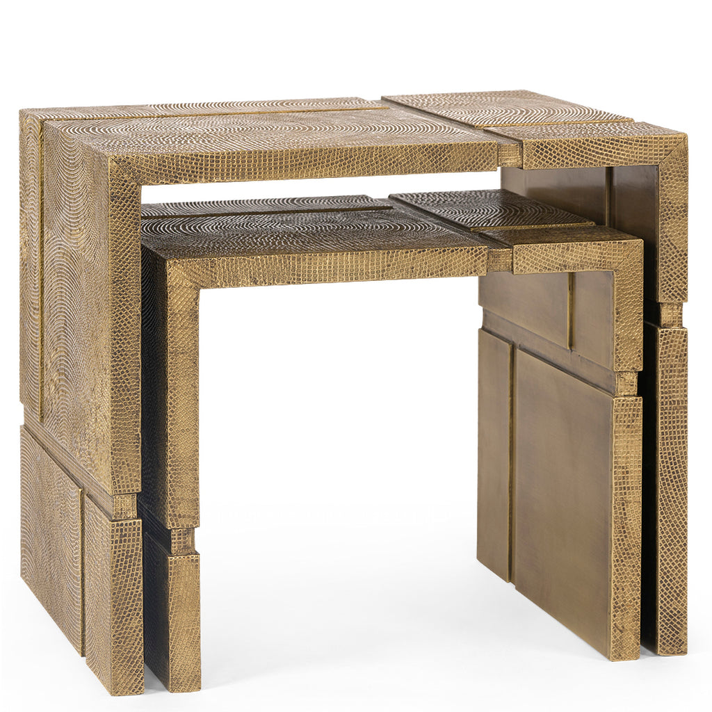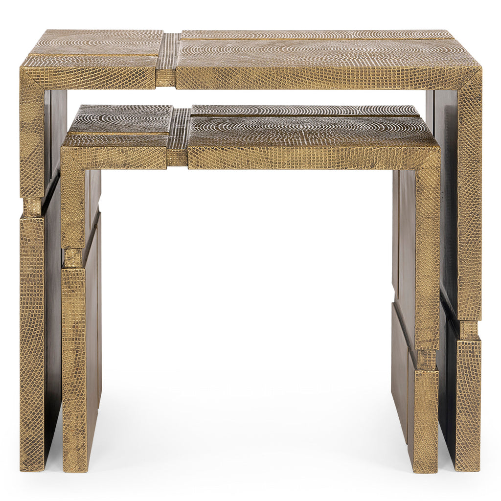 Experience the allure of the Hollis Nesting Tables—an exquisite blend of form and craftsmanship that transcends the ordinary. The captivating waterfall silhouettes, meticulously hand-crafted from brass cladding with a darkened antique finish, command attention in any space. Adorned with a geometric pattern, created by a series of precisely constructed linear recesses, exudes sophistication and depth. The elaborate hand-hammered design on the surfaces add decorative flair and tactile intrigue, forming a mesmerizing effect. Whether adorning a softly decorated living room or complementing modern industrial schemes, the Hollis Nesting Tables effortlessly infuse structured shape and timeless elegance into your interior design vision.