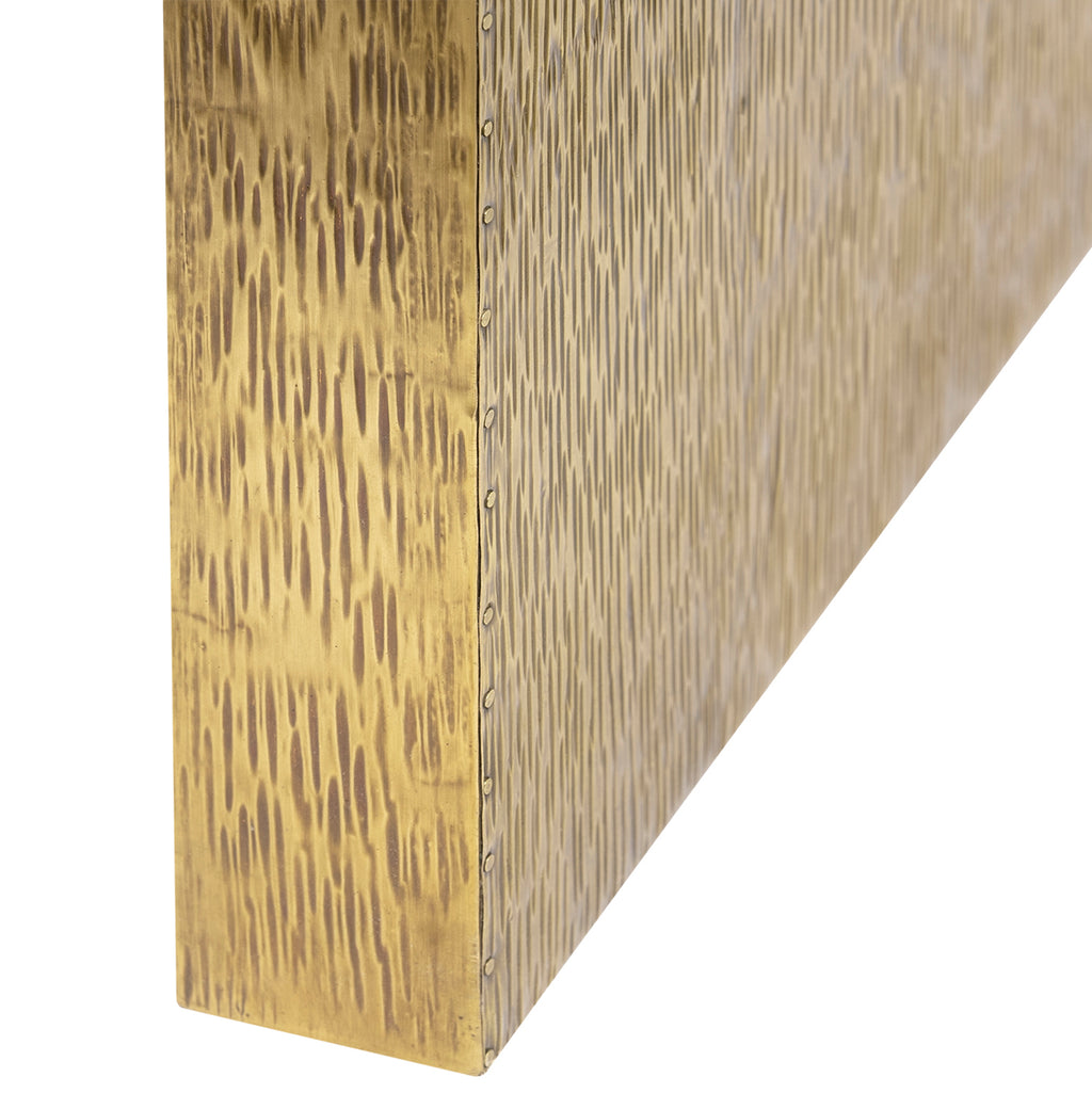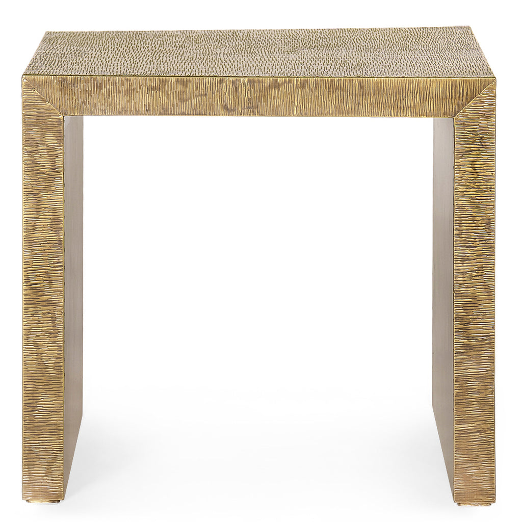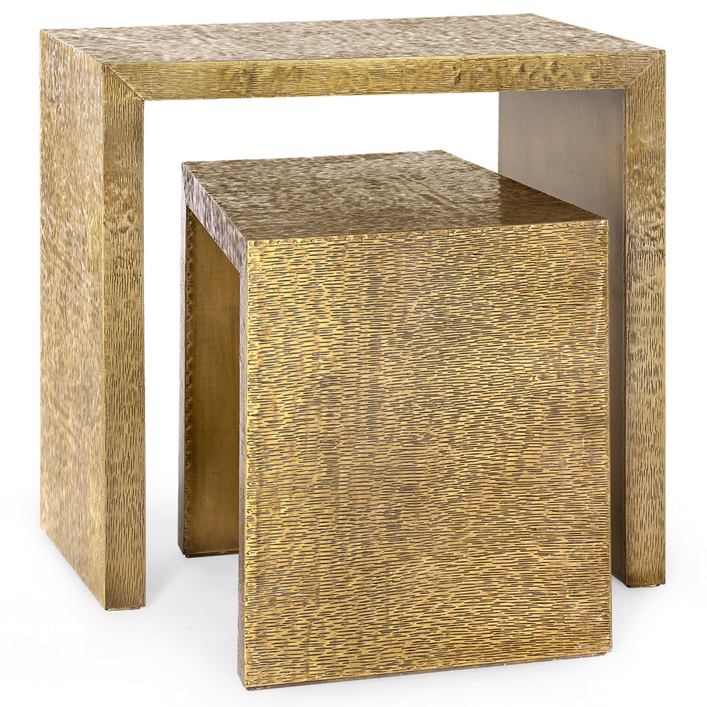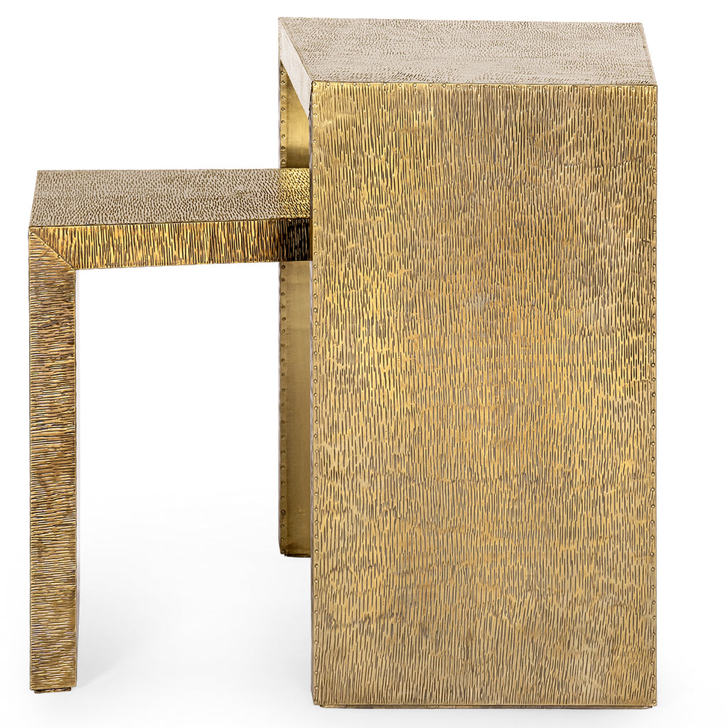 The exquisitely crafted Linus Nesting Tables are finished with a beautiful antique brass cladding that radiates sophistication. Each table boasts a distinctive textured surface that mimics the intricate patterns of fabric or wood grain, with sides accented by delicate little finishing studs. Their smaller scale makes them perfect for compact spaces or intimate gatherings, ensuring versatility, and providing a chic accent to any room they grace.