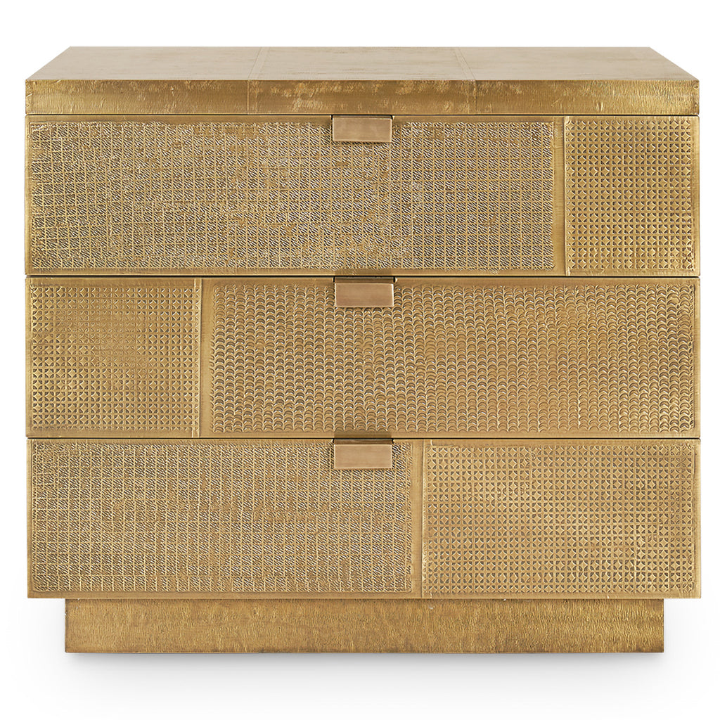Indulge in the allure of the Mark 3-Drawer Side Table—an exquisite fusion of artistry and functionality. Crafted from hand-hammered brass sheets, adorned with intricate patterns, it exudes opulence and sophistication. Custom-designed stealth edge pulls seamlessly integrate with the piece, while the painted interior adds depth. The brass exterior undergoes a bespoke antiquing process, resulting in a muted hue that exudes understated elegance. With its durable metal construction, this table promises longevity and resilience. Whether as a pair of nightstands or stately side tables flanking a sofa, the Mark Side Table is a testament to timeless style and impeccable craftsmanship.
