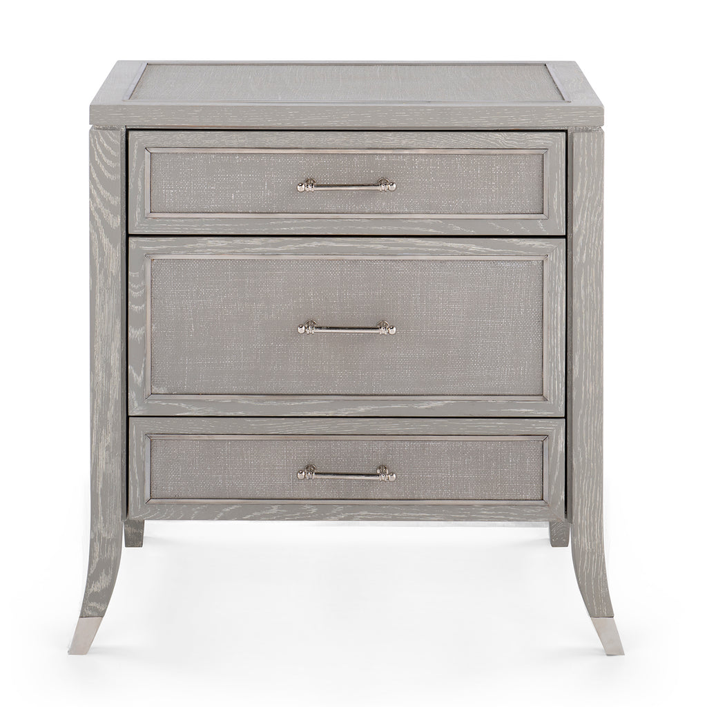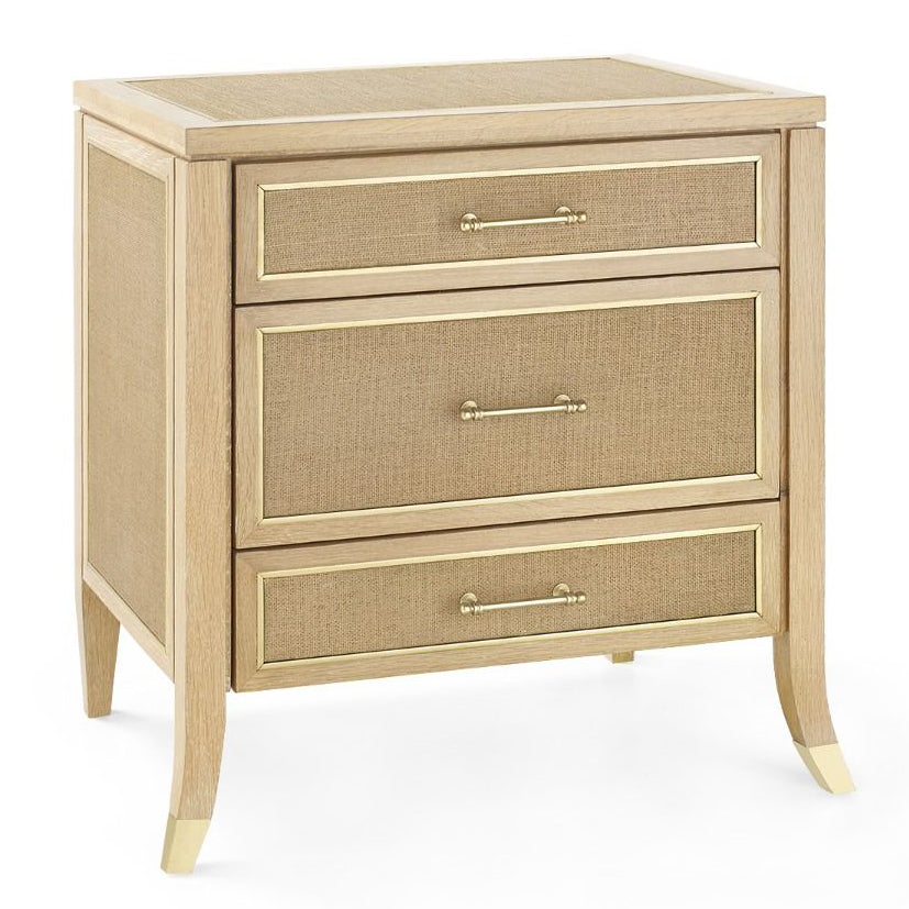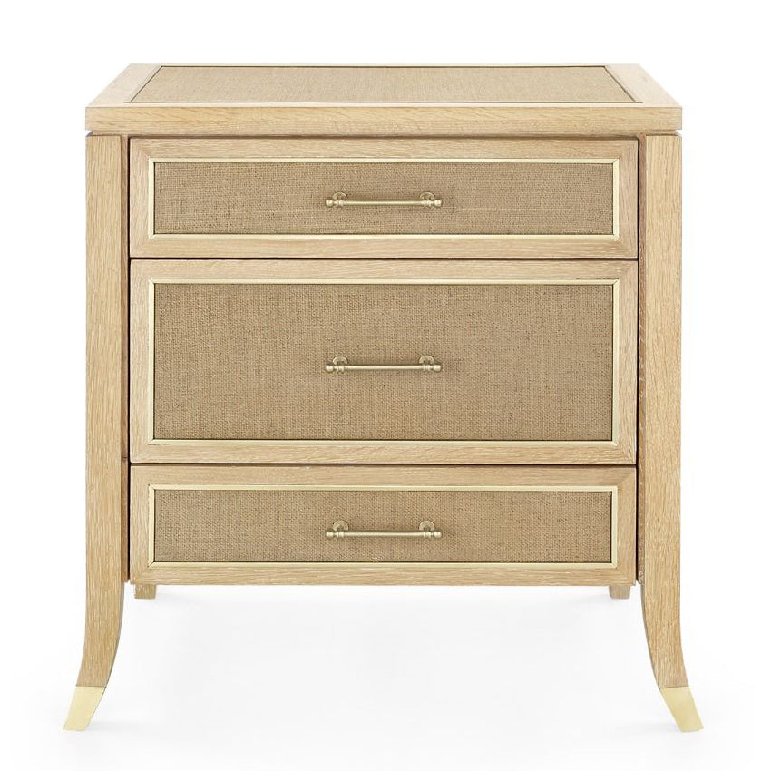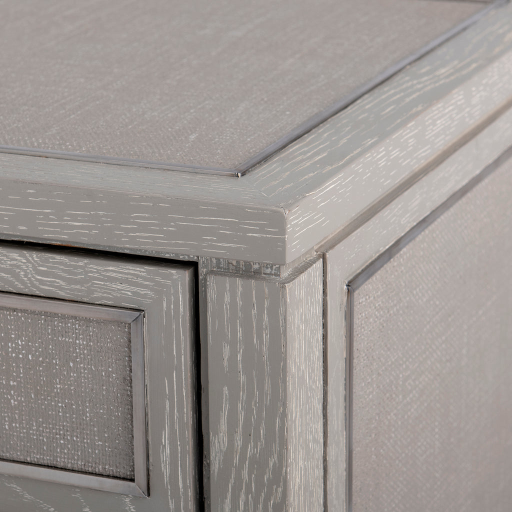 The V&H Paulina Collection weaves texturally unique lacquered woven jute and the expressive design of quarter sawn oak veneer into a stylish design. The subtle detail of solid brass framing around the drawers adds just the right touch of handcrafted elegance. Custom cast brass pulls and solid brass sabots anchoring gracefully tapered legs, ensure the piece will be treasured for years.