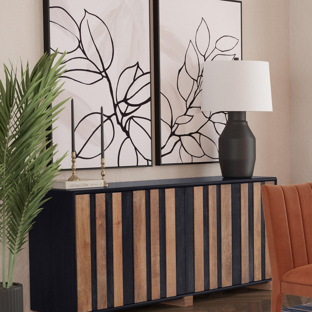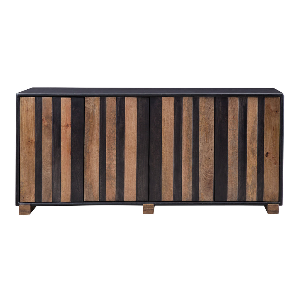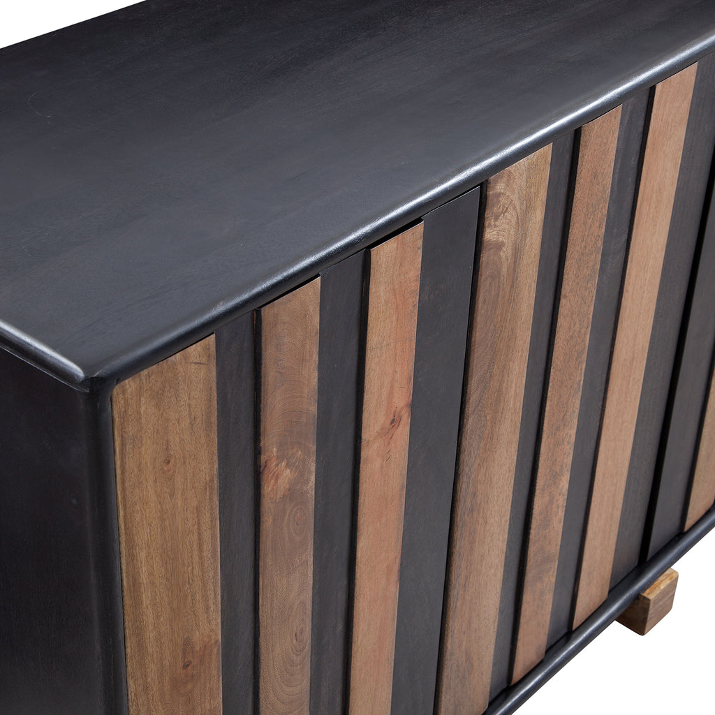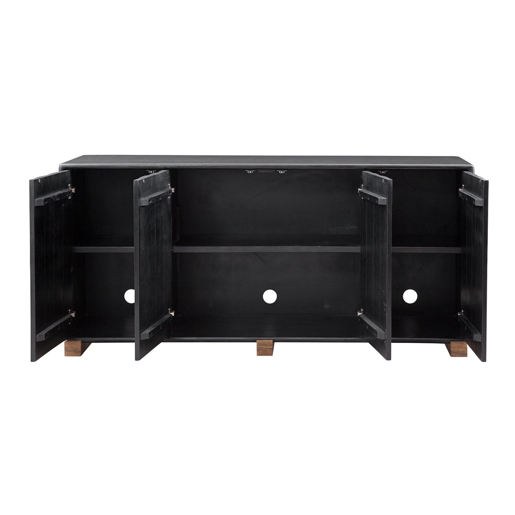 The Adrienne Server is a blend of modern design meeting a warm, moody color palette. The doors feature a planking effect with push-clasp hardware, adding character. Inside, find practicality with adjustable shelves and media cord management. Mango wood boasts a naturally textured finish with a charming distressed effect.