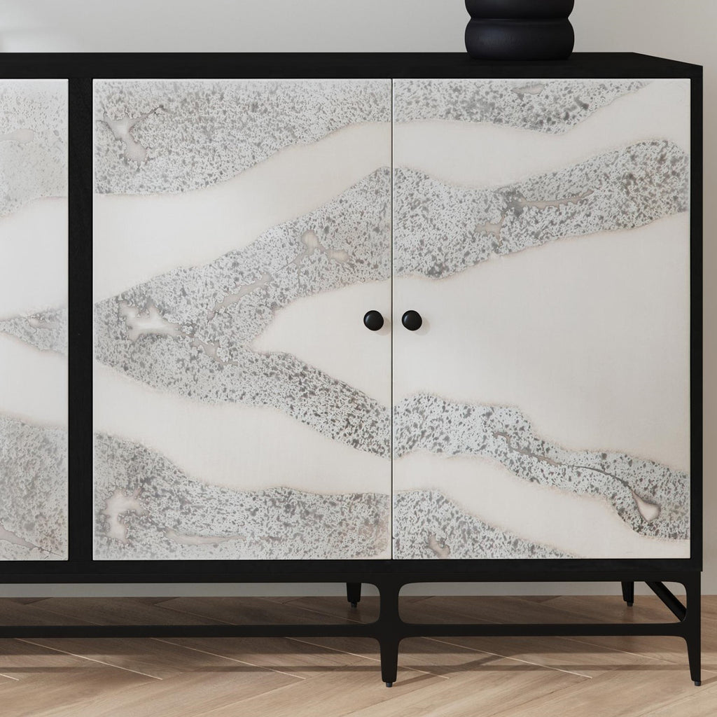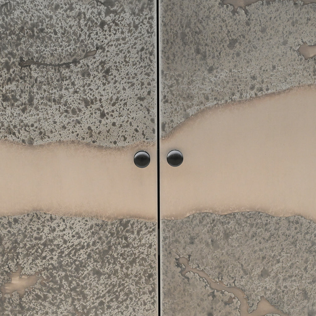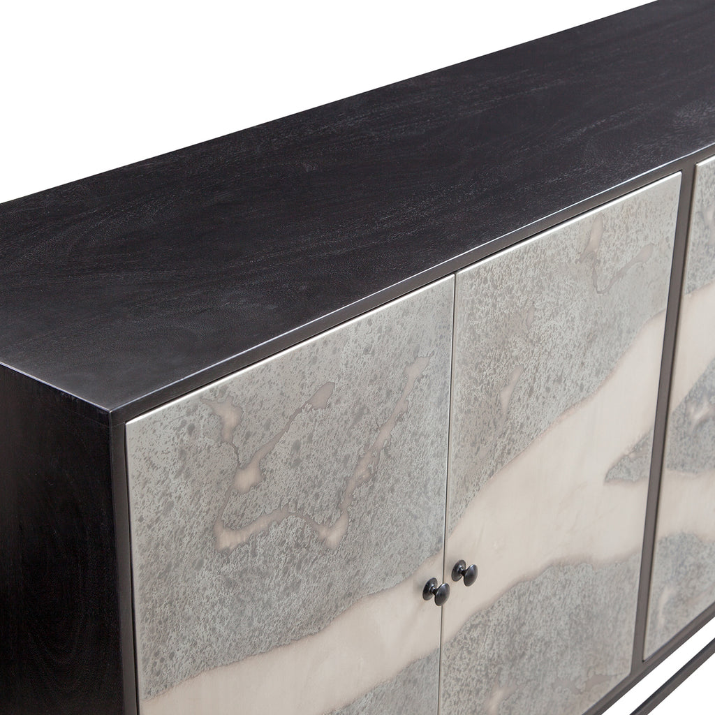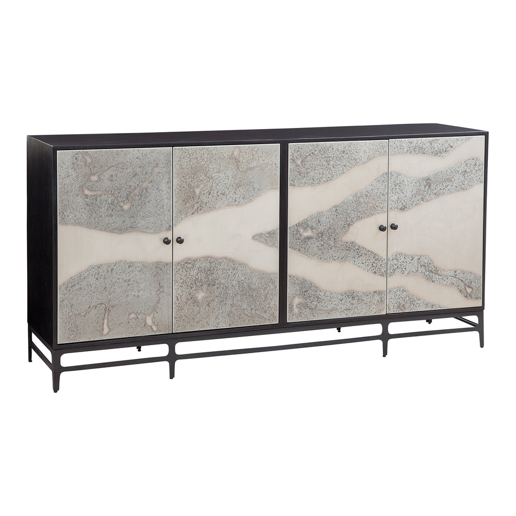 The Caspar Iron Sideboard blends modern luxe design with lasting craftsmanship. Fashioned from solid iron, each of its four doors undergoes a manual acid-wash finishing process, resulting in a distinctive landscape effect that adds character to every piece. Inside, find functionality with four shelves and media cord management.