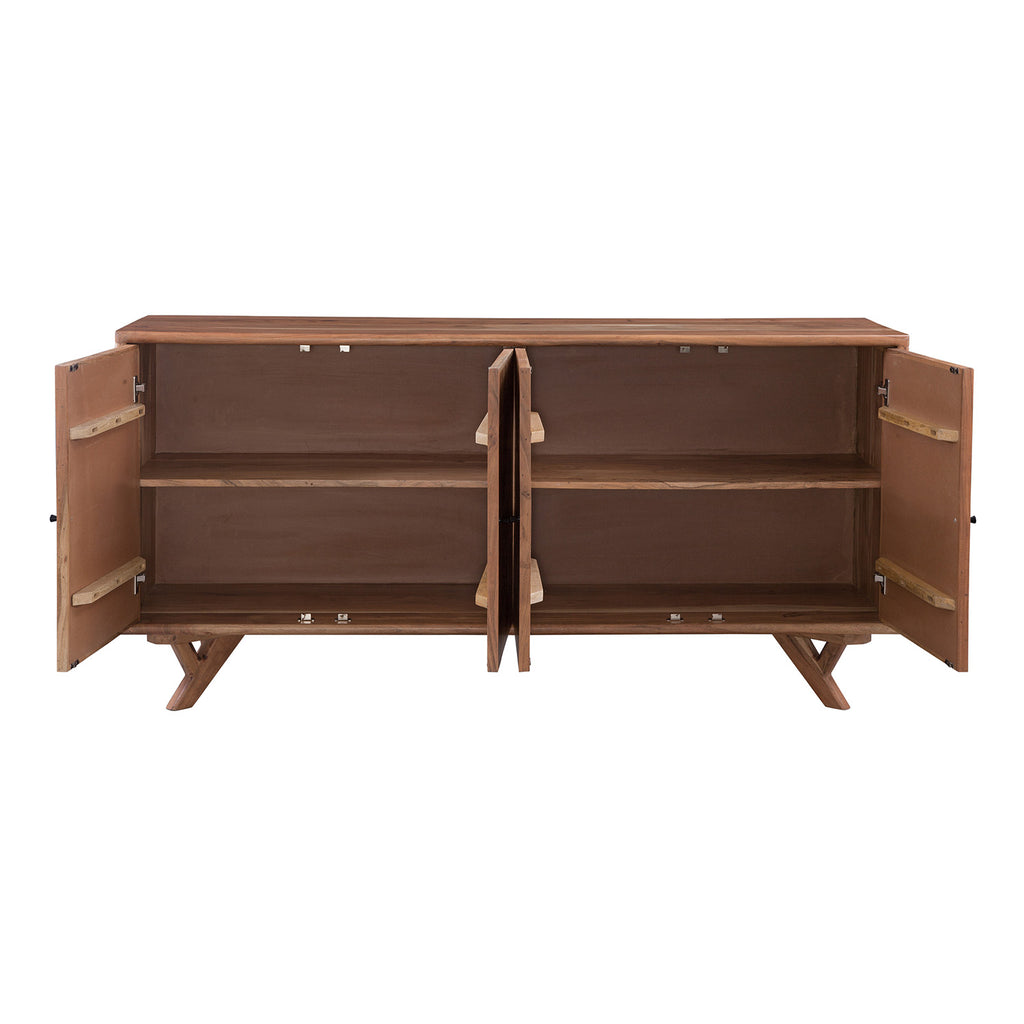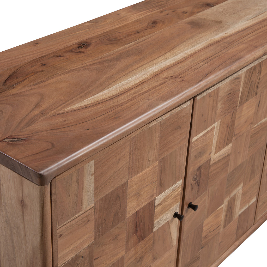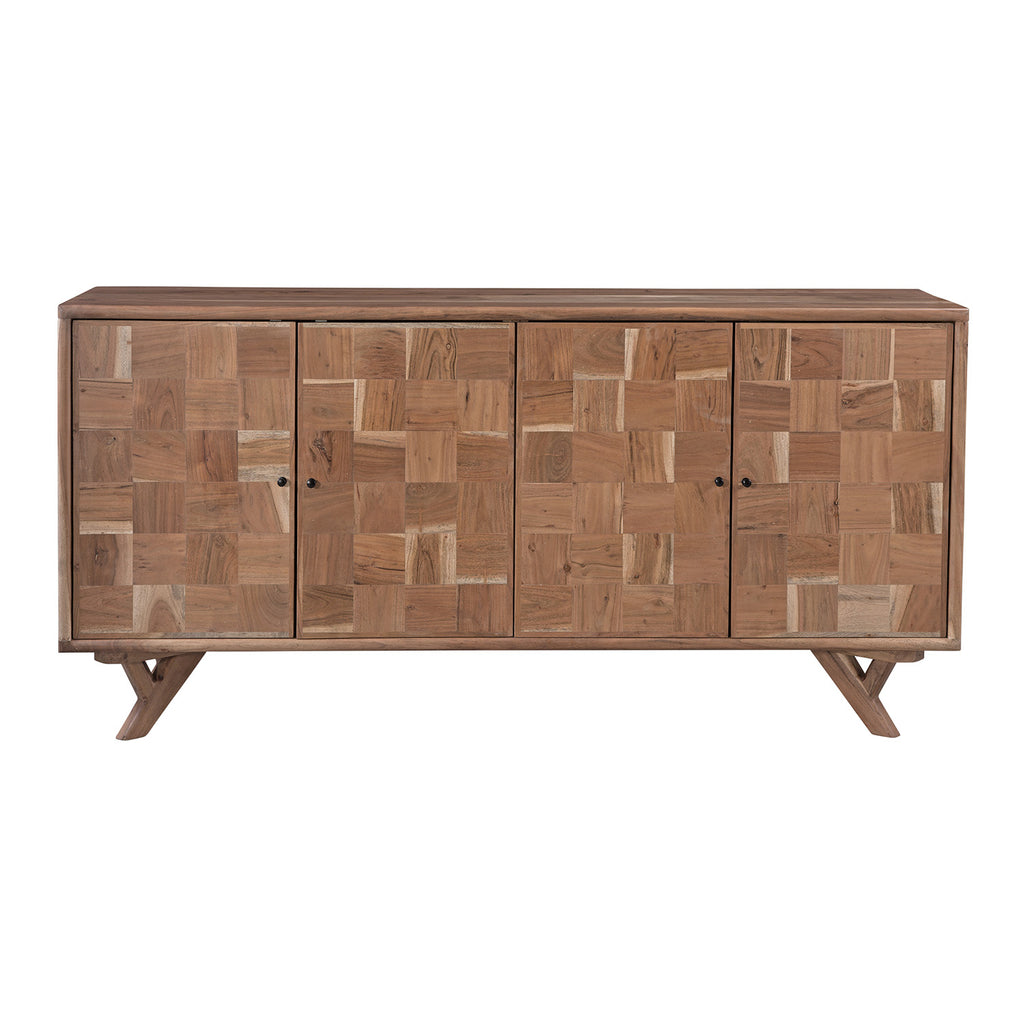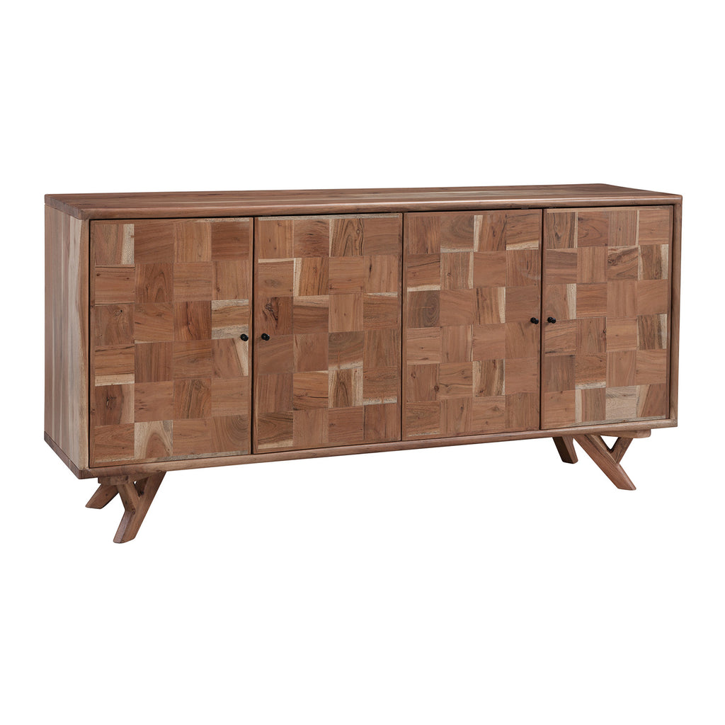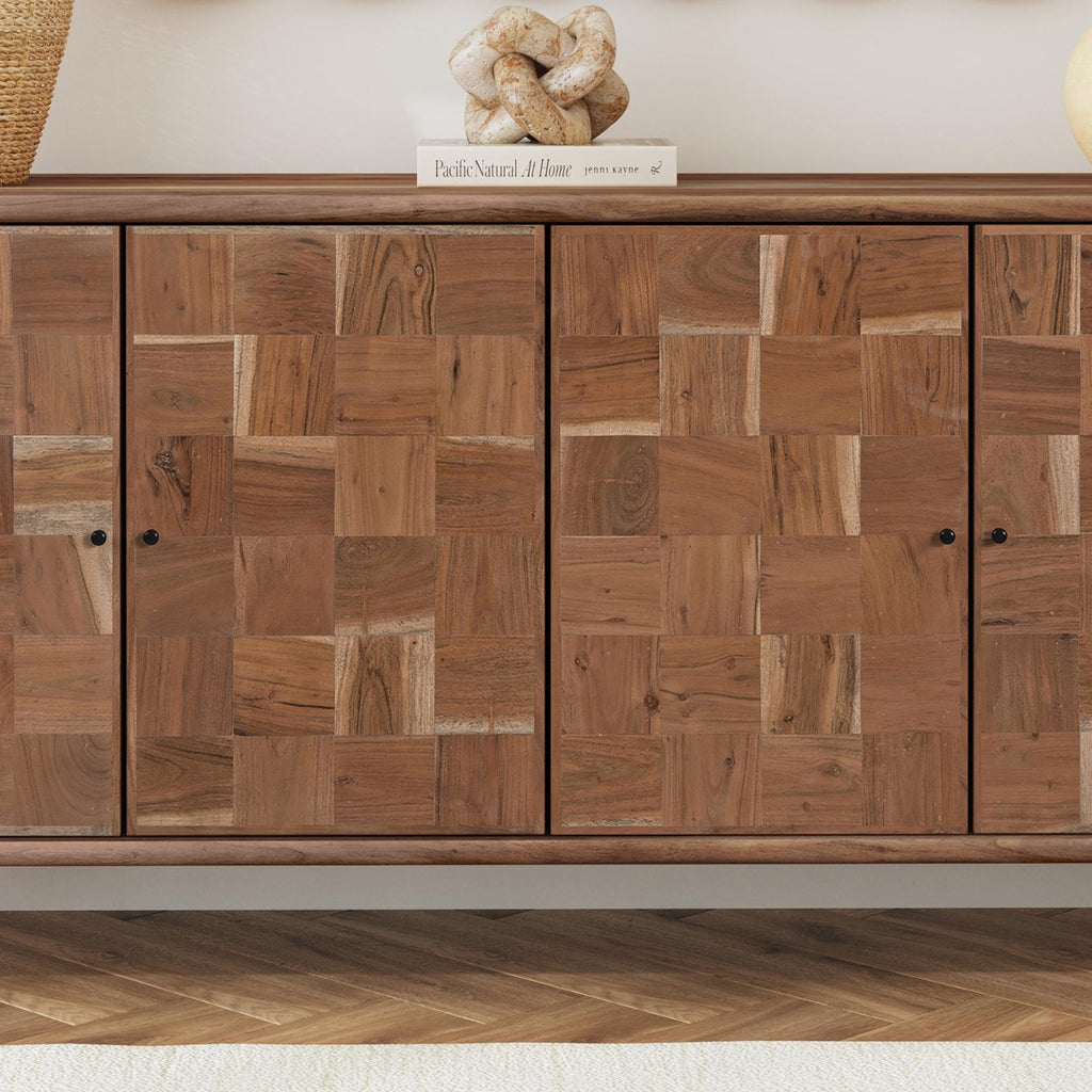 The Jarvis Server blends modern style with solid mango wood in a natural finish. With four doors showcasing a subtle patchwork pattern and matte black knobs, it offers both style and functionality. Inside, adjustable shelves with media cord management cater to your needs. Finished in natural mango with matte black accents, it boasts durability and elegance. Crafted from solid mango wood, each piece embraces natural wood grain variations.