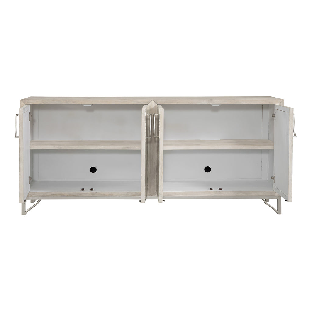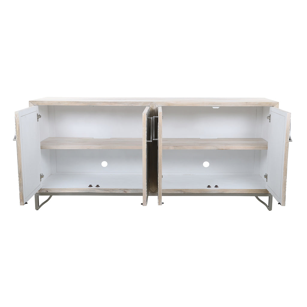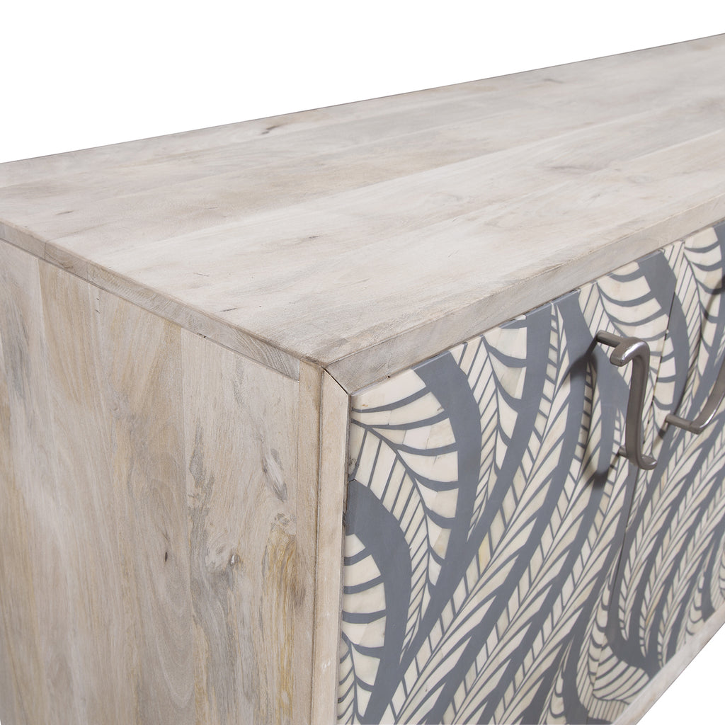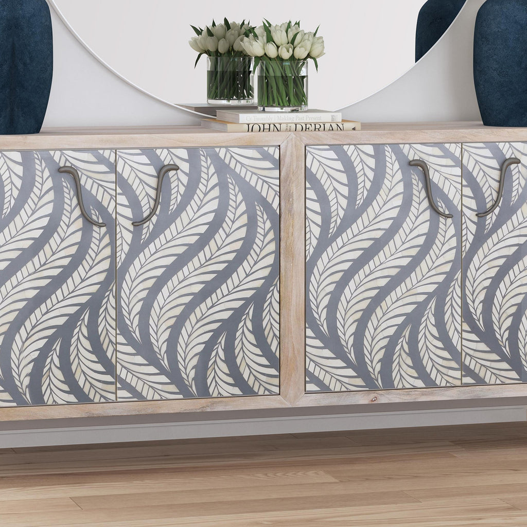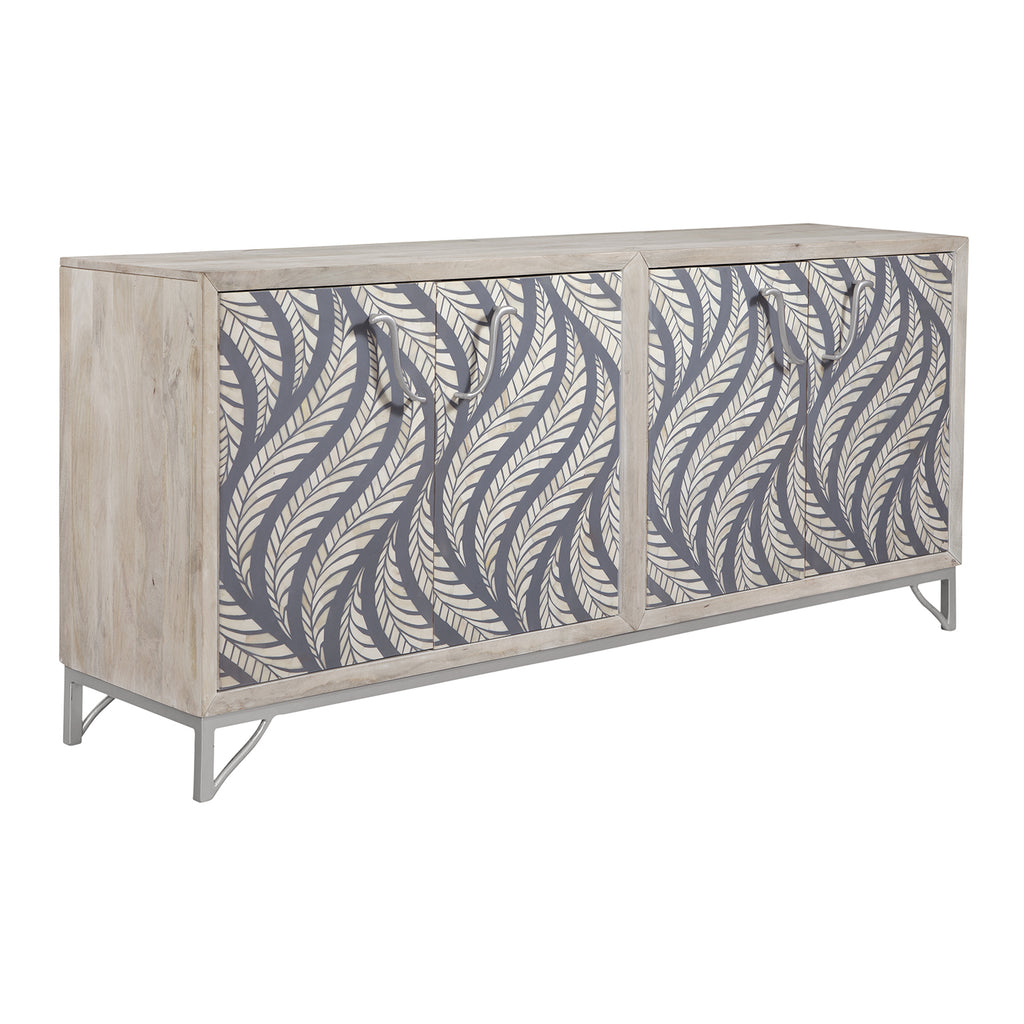 The Leia Server is a stunning modern piece, featuring a solid mango wood case frame finished in a light bleached tone. Its intricately patterned door fronts showcase hand-laid bone and light grey resin, reflecting exceptional craftsmanship. Custom iron hardware adds a touch of sophistication, while the cool pewter-finished base enhances its contemporary appeal. This server embodies bespoke design, making it a standout addition to any dining space. With its unique aesthetic, the Leia Server combines style and functionality effortlessly.