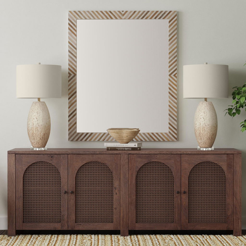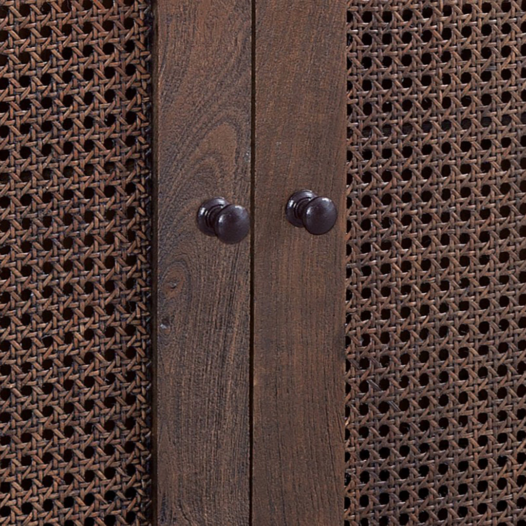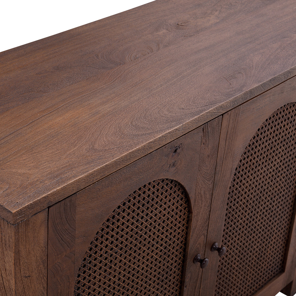 Introducing the Walsh Server, a blend of rustic modern farmhouse design that adds warmth to your space. Crafted from solid mango wood, it boasts a delicate antique walnut stain finish. The four doors feature arched open cane inserts for character. Inside, find practicality with two adjustable shelves and media cord management.