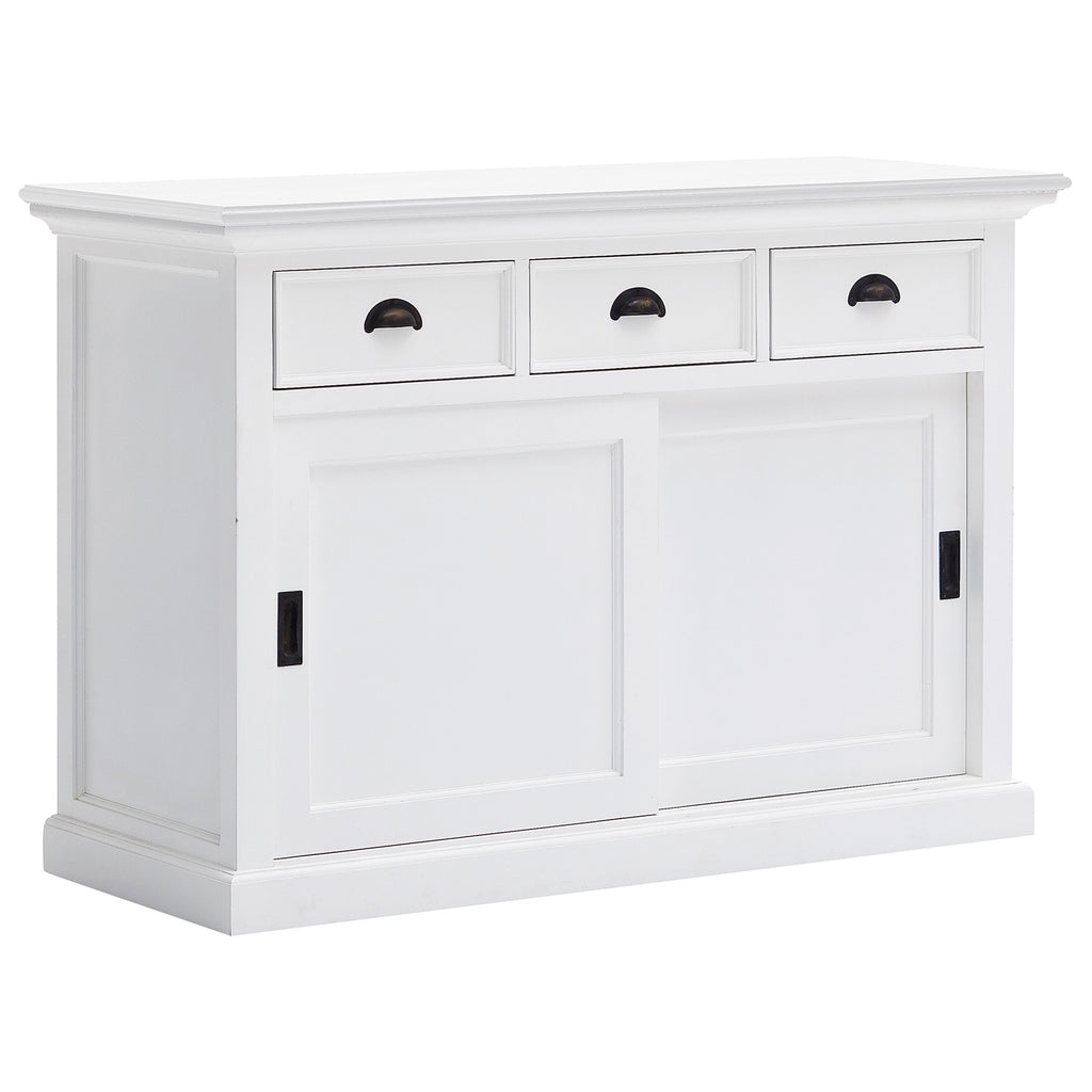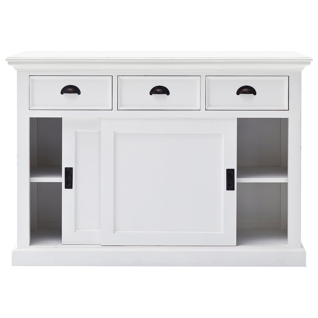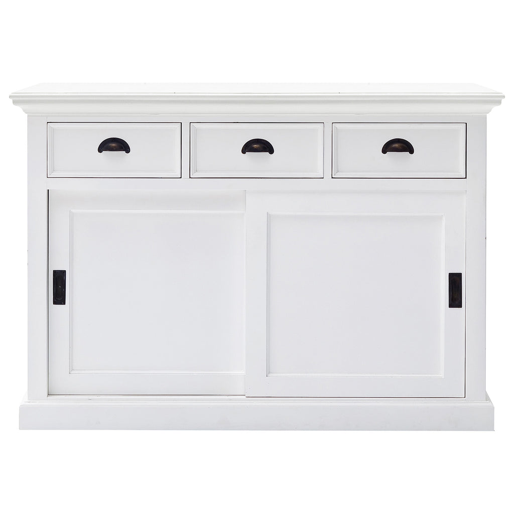 Beckton combines the quaint charm of the French Countryside with the coastal flair of the Eastern Seaboard to form a comprehensive range befitting the dining area, living space or bedroom. Detailed profiling on each piece, together with the warm finishing and antique brass hardware, provides a classic collection for the contemporary home. This variation on our classic buffet maintains its quaint charm with detailed crown moulding, but offers the option of sliding doors in combination with three generous drawers. Compact and versatile in the living or dining areas.