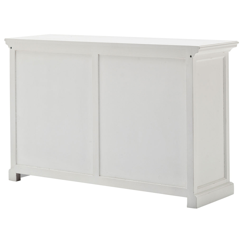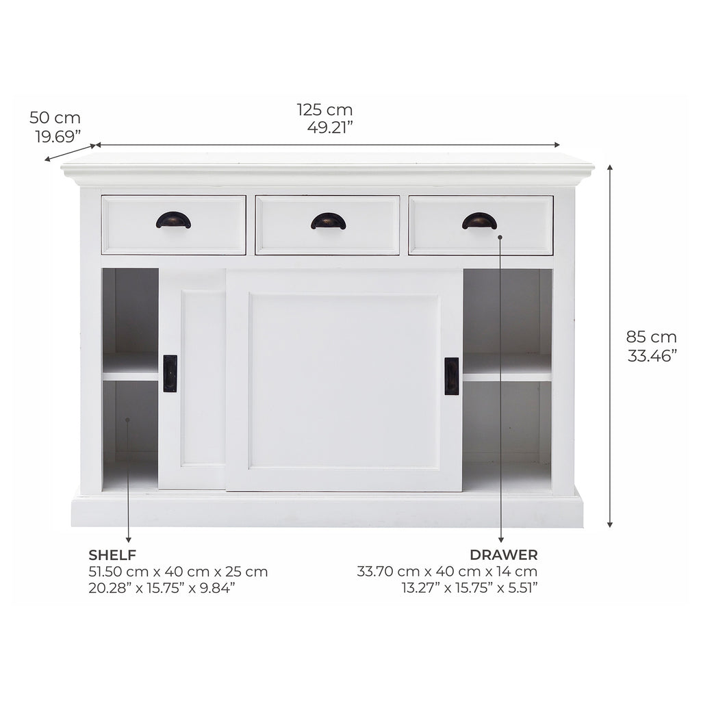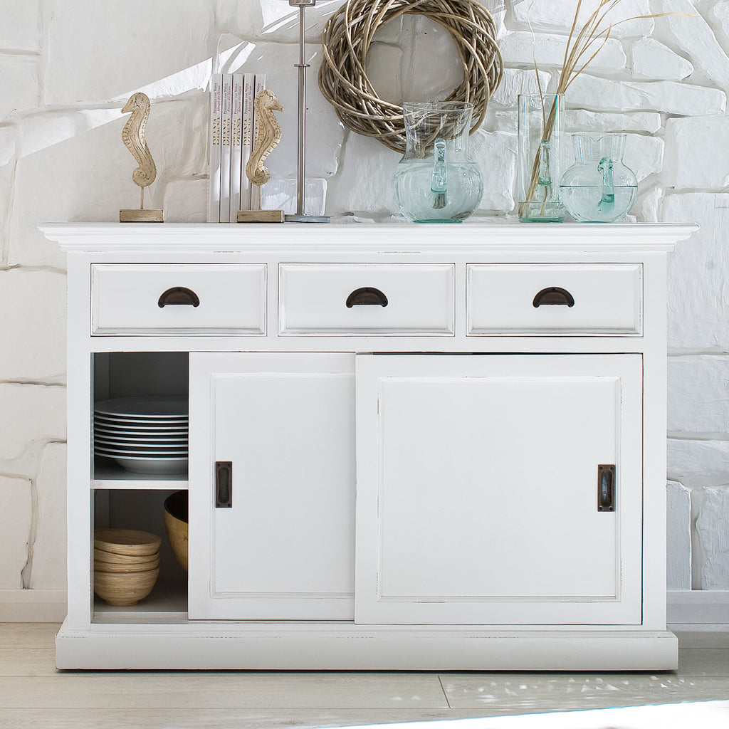 Beckton combines the quaint charm of the French Countryside with the coastal flair of the Eastern Seaboard to form a comprehensive range befitting the dining area, living space or bedroom. Detailed profiling on each piece, together with the warm finishing and antique brass hardware, provides a classic collection for the contemporary home. This variation on our classic buffet maintains its quaint charm with detailed crown moulding, but offers the option of sliding doors in combination with three generous drawers. Compact and versatile in the living or dining areas.