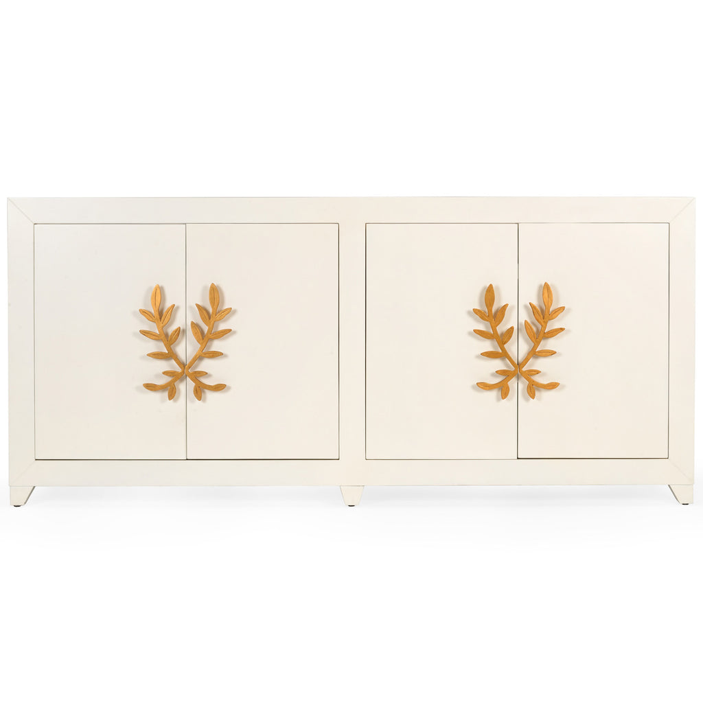 This cabinet from Chelsea House captures attention with eye-catching, yet understated style. A gorgeous furnishing for storing everyday items, this chic piece captivates with modern sophistication. The Chelsea House Longleaf 4-Door wooden cabinet in White lacquer or Weathered Gray with vine handles in Gold Leaf with 2 glass shelves, not intended for clothes storage.